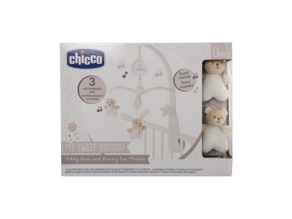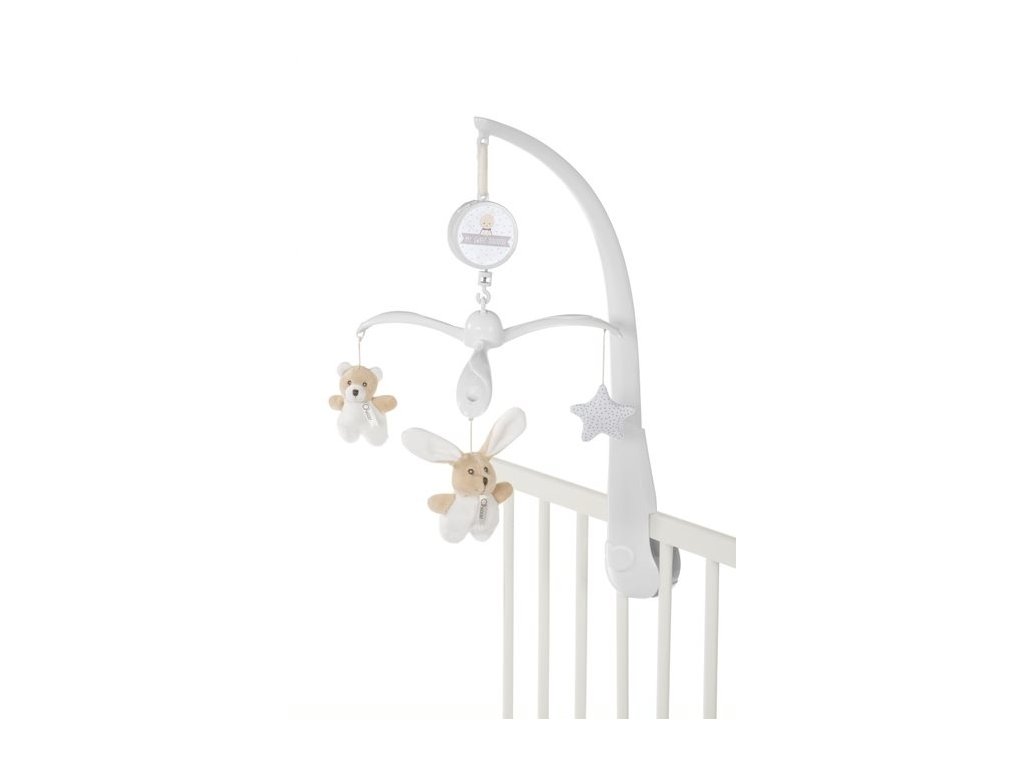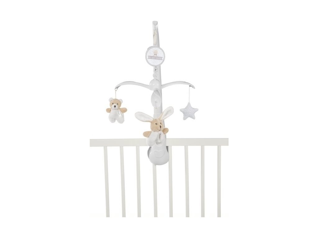 MŮJ SLADKÝ KOLOTOČ DOUDOU BEAR & BUNNY je mobilní hrací skříň do postýlky se 3 měkkými plyšovými přívěsky ve tvaru zajíčka, medvídka a hvězdy. Mobil namontovaný na okraji postýlky zabaví a zabaví miminko během dne a díky sladkým melodiím navodí atmosféru klidu a relaxace těsně před spaním («Ukolébavka» WA Mozart).