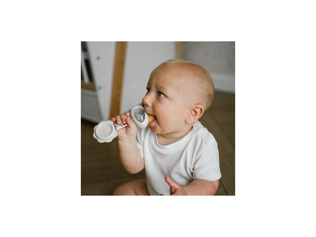 Przyjemny w dotyku silikonowy gryzak delikatnie masuje dziąsła dziecka i pozwala złagodzić ból podczas ząbkowania.