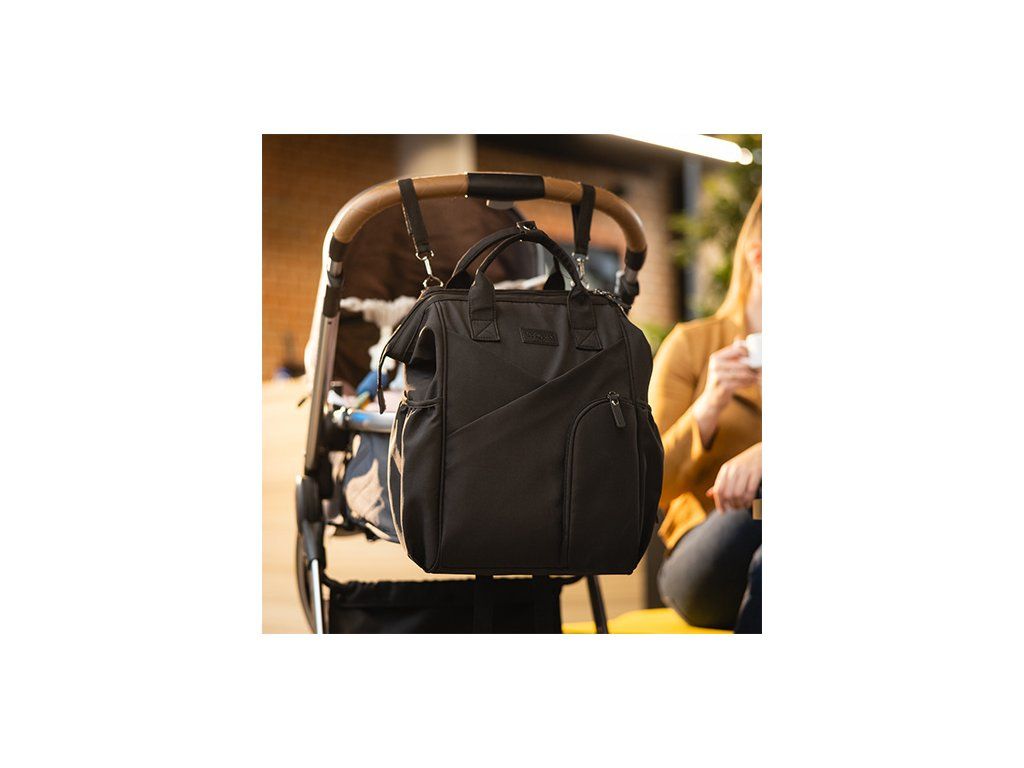 W zestawie z plecakiem znajdziesz zaczepy, dzięki którym zawiesisz go na wózku. Sprawdzi się jako praktyczny torbo-plecak do spacerówki lub gondoli.
