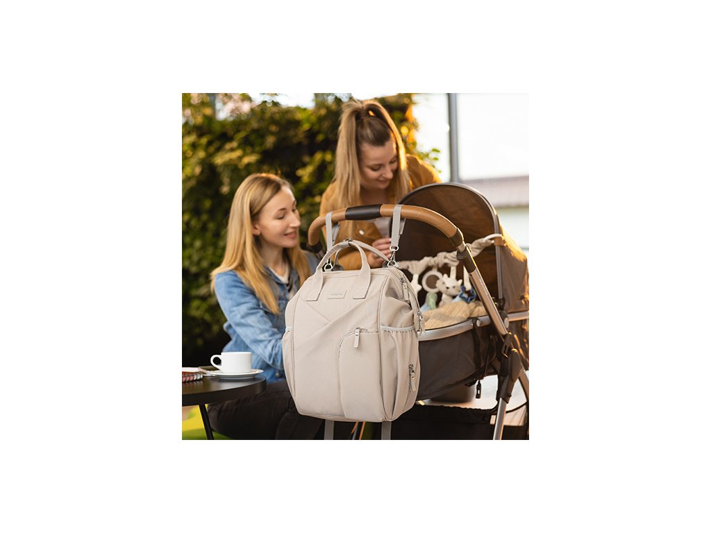 W zestawie z plecakiem znajdziesz zaczepy, dzięki którym zawiesisz go na wózku. Sprawdzi się jako praktyczny torbo-plecak do spacerówki lub gondoli.
