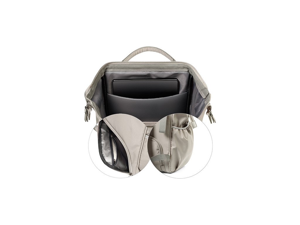 Nasz plecak na rzeczy mamy i niemowlaka zaprojektowaliśmy tak, byś niczego nie musiała szukać w pośpiechu. Ma wiele praktycznych schowków i kieszonek, do których masz łatwy dostęp. W przedniej kieszeni będziesz mieć wszystko pod ręką– telefon, chusteczki, krem. Wewnątrz znajdziesz specjalne miejsce na tablet czy laptopa, kieszenie na pieluszki i butelkę oraz wodoodporną kieszeń na mokre rzeczy. Po bokach umieściliśmy praktyczne kieszenie zewnętrzne na butelki lub bidon. Dwukierunkowy zamek sprawi, że wygodnie i szybko dostaniesz się do głównej komory.