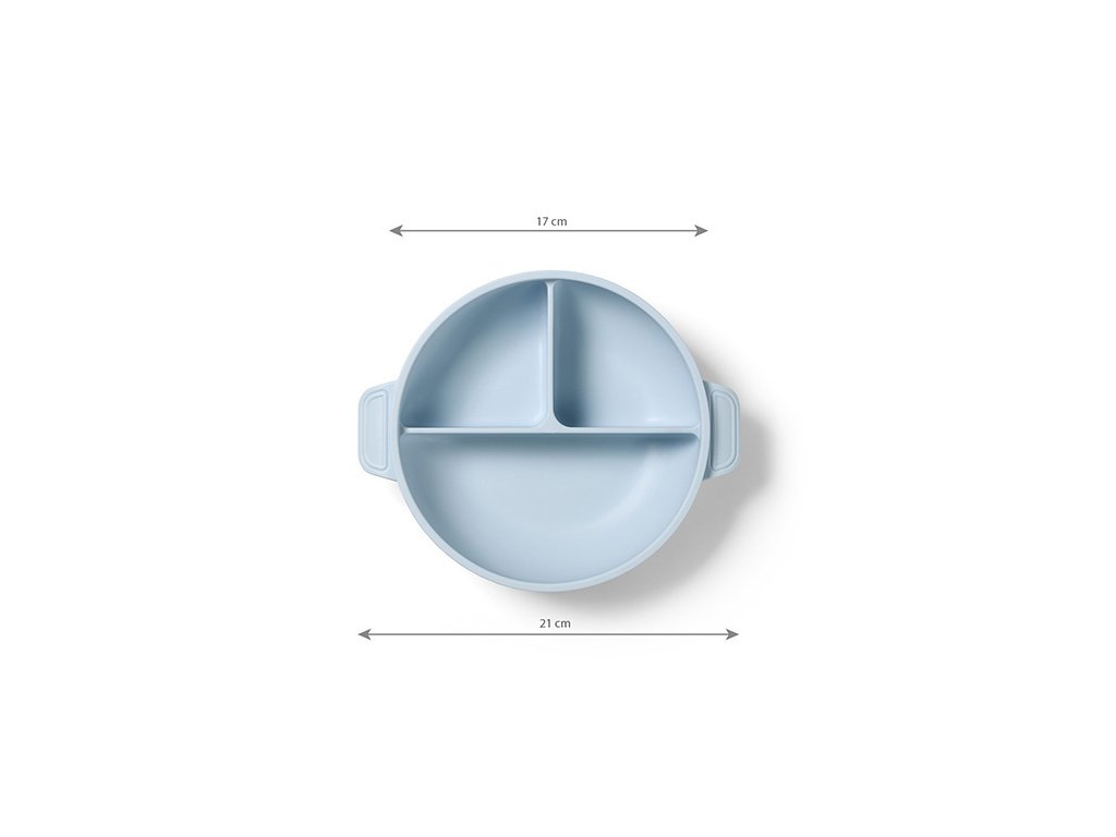 Talerzyk z 3 przegródkami pozwala podzielić posiłek na różne części. Składniki nie mieszają się, a Twój szkrab może próbować każdego smaku po kolei.