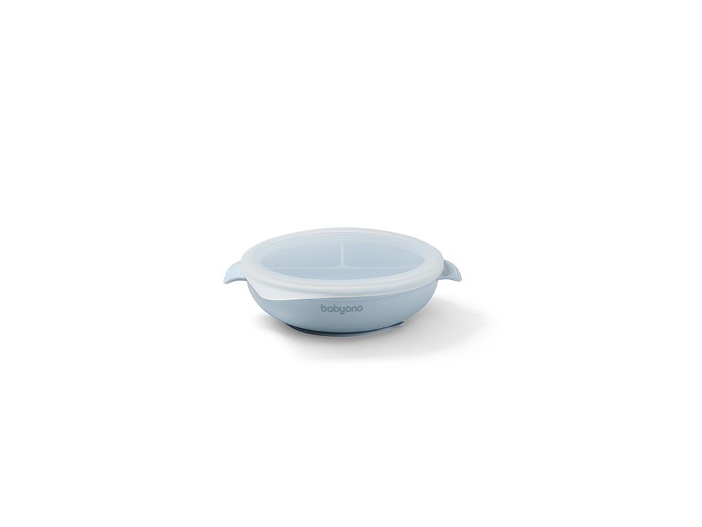 Trójdzielny talerz z przyssawką i przykrywką Babyono to Twój pomocnik przy rozszerzaniu diety maluszka, zwłaszcza metodą. Wprowadza nowe smaki, wspiera samodzielne jedzenie i ogranicza bałagan. Mocna przyssawka trzyma silikonowy talerz na swoim miejscu, a zaokrąglony kształt ułatwia nabieranie pokarmu. Trzy przegródki pozwalają rozdzielić składniki, by dziecko mogło próbować każdego smakołyku osobno. Pokrywka utrzymuje ciepło i świeżość posiłków, a antypoślizgowe uchwyty umożliwiają wygodne przenoszenie naczynia. Talerzyk z podziałką i pokrywkę wykonaliśmy z bezpiecznego i trwałego silikonu. Możesz bez obaw podgrzewać je w mikrofalówce i myć w zmywarce.