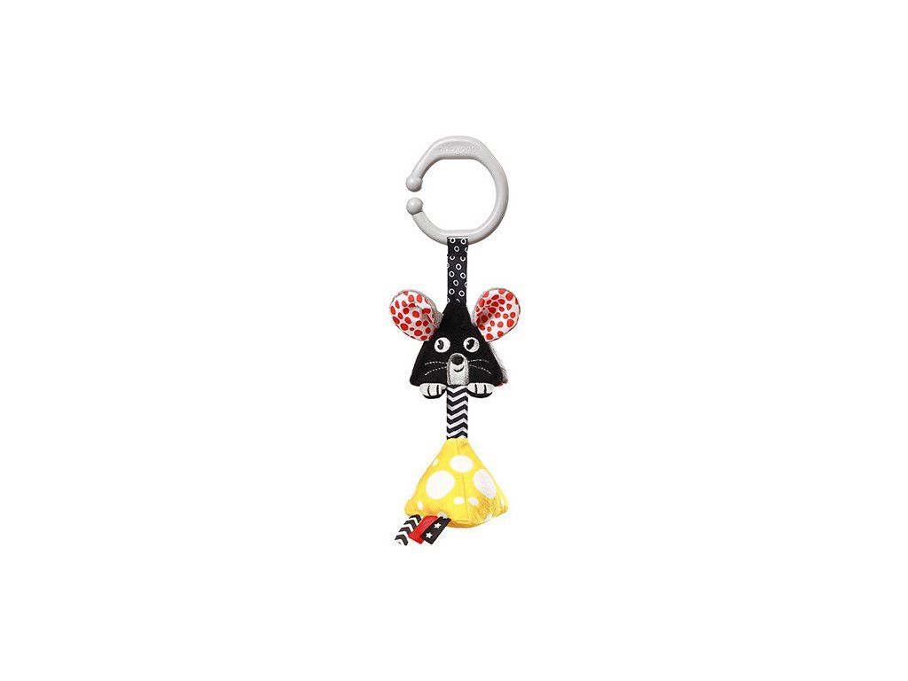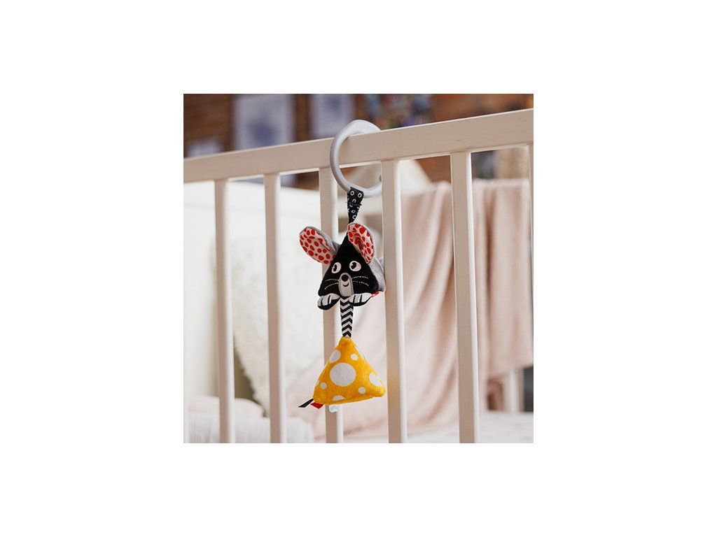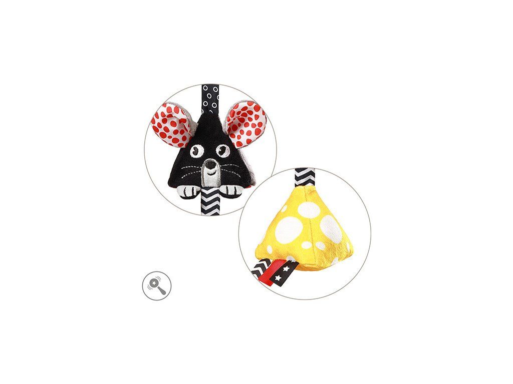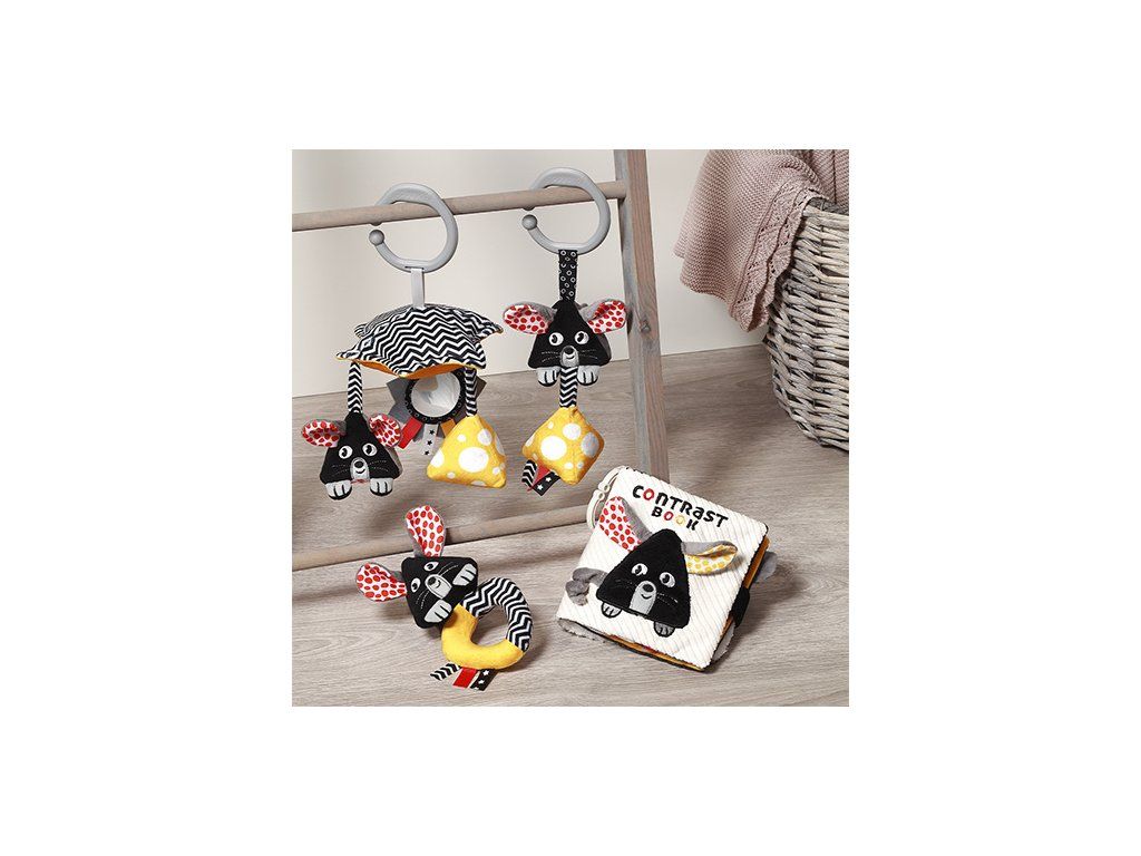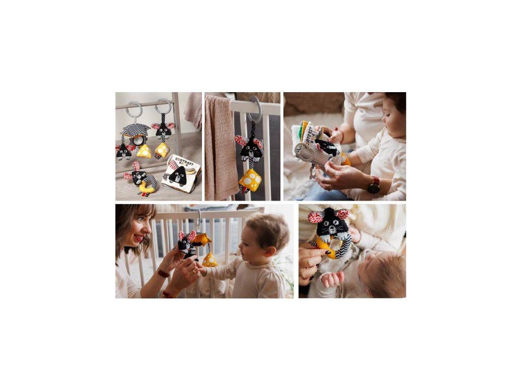 Nasza kontrastowa zawieszka to sensoryczna zabawka, która wprowadzi Twojego maluszka do świata pierwszych kolorów, dźwięków i faktur. Zamocuj ją na łóżeczku, wózku lub foteliku. Grzechoczący serek i myszka oraz szeleszczące uszy pobudzają słuch i uczą różnych dźwięków. Barwne metki i zakręcony ogonek zachęcają do chwytania i ćwiczenia zwinności paluszków. Czarno-biała zawieszka do wózka z żółtymi i czerwonymi akcentami oraz geometrycznymi wzorami wspaniale stymuluje wzrok już od pierwszych miesięcy życia. Stworzyliśmy ją z bezpiecznych, miękkich materiałów i dopasowaliśmy do małych rączek. Maluch rozwija wyobraźnię, zmysły i motorykę małą.