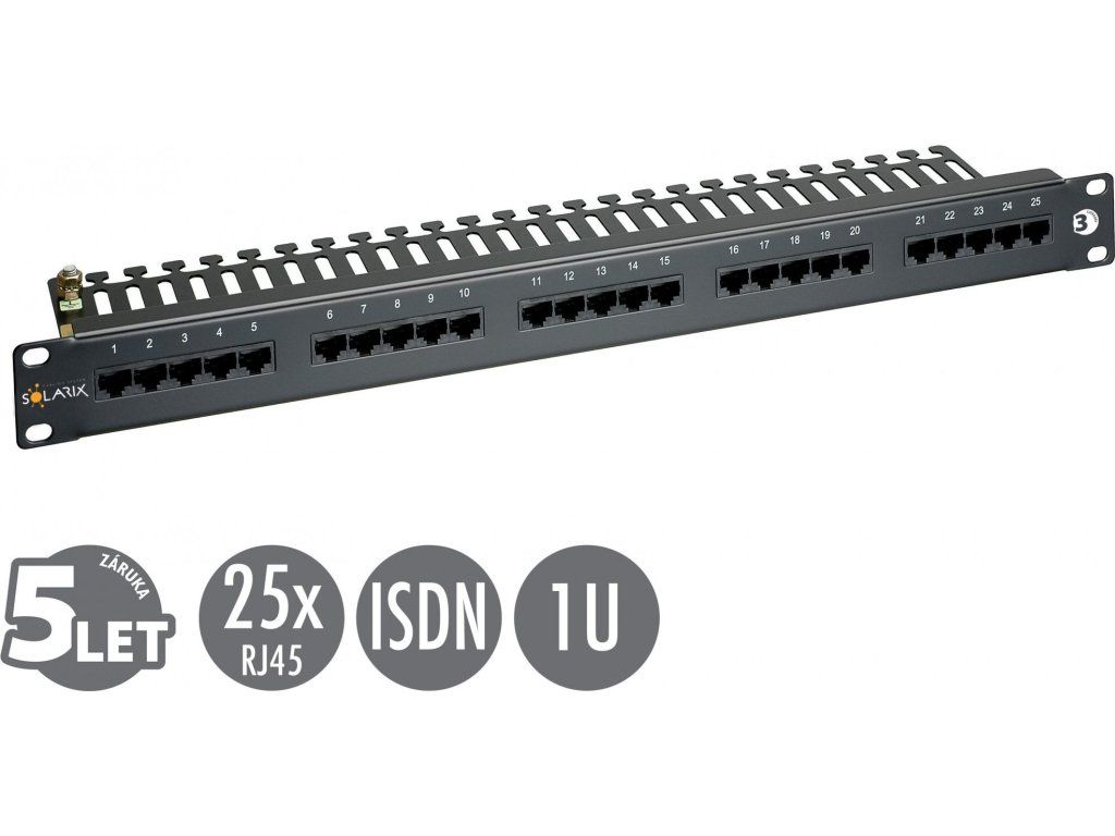 Solarix ISDN patch panel SX25-ISDN-BK je kvalitní telefonní panel určený pro tu část strukturované kabeláže, která slouží pro připojení uživatelských pracovišť k telefonní ústředně. Panel je osazen 25 porty typu RJ45 a zakončovacími moduly s duální svorkovnicí 110/Krone. Součástí panelu je vyvazovací lišta, která umožňuje přehledné uspořádání a pevné uchycení telefonního kabelu přímo k tělu patch panelu. Přednostmi ISDN panelů Solarix je jejich vysoká spolehlivost, životnost a především jednoduchá instalace. Panely splňují všechny požadavky definované pro kategorii 3. Barva ISDN patch panelů Solarix je černá. Velikost v datovém rozvaděči je 1U.