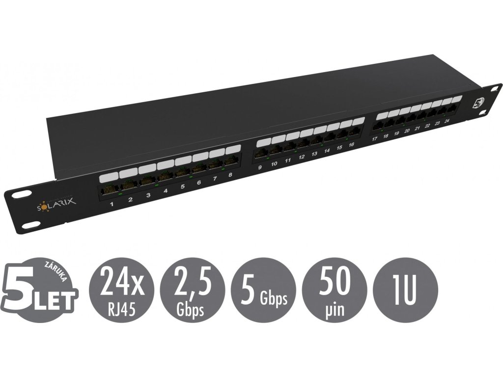 Stíněný patch panel Solarix – kategorie 5E s označením SX24-5E-STP-BK-N je dodáván v provedení s 24 porty RJ45. Panel je osazen moduly s duální IDC svorkovnicí 110/Krone. Svorkovnice je z důvodu snadného zakončení kabelu označena podle standardu T568A i T568B. Součástí těla panelu je vyvazovací lišta, která slouží k přehlednému uspořádání a pevnému uchycení datového kabelu. Stíněný patch panel Solarix SX24-5E-STP-BK-N splňuje požadavky na komponenty kategorie 5E a třídu vedení Class D, které jsou definovány ve standardech ANSI/TIA 568, ISO/IEC 11801 a EN 50173, a to včetně všech nejnovějších dodatků. Panel je pevný, spolehlivý a poskytuje dlouhou životnost. Standardní barva patch panelu je černá. Velikost v datovém rozvaděči je 1U. Součástí balení je 4x M6 montážní sada, a 24x vyvazovací pásek. Tento nový patch panel Solarix nahrazuje panel s označením SX24-5E-STP-BK.