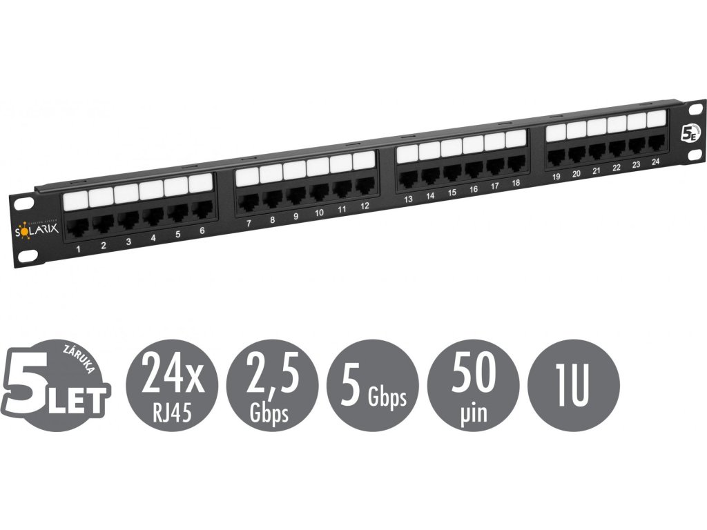 Nestíněné patch panely produktové řady Solarix – kategorie 5E jsou dodávány v provedení 12, 24 a 48 portů RJ45 a jsou osazeny moduly s duální IDC svorkovnicí typu 110/Krone. Každý kontakt je na této svorkovnici z důvodu snadného zakončení kabelu označen barvami podle typu zapojení, a to buď podle standardu T568A, nebo T568B. Tyto komponenty strukturované kabeláže Solarix jsou vyrobeny tak, aby zaručovaly dlouhou životnost, vynikající funkčnost a především spolehlivost. Nestíněné patch panely Solarix – kategorie 5E jsou testovány až do šířky pásma 150 MHz a převyšují tak požadavky na komponenty kategorie 5E/Class D definované v mezinárodních normách ANSI/TIA 568, ISO/IEC 11801 a EN 50173, včetně všech nejnovějších dodatků. Standardní barva patch panelů je černá. Velikost v datovém rozvaděči je 1U.