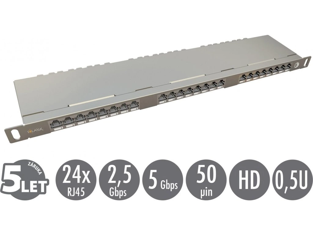Patch panely Solarix s označením SX24HD-6-STP-SL jsou vysokohustotní 19" patch panely s výškou 0,5U, které jsou osazeny 24 porty RJ45 a duální IDC svorkovnicí 110/Krone. U těchto panelů je důraz kladen na maximální úsporu místa v rozvaděči, kdy do výšky 1U lze jednoduše nainstalovat až 48 portů. Tyto high-density panely Solarix jsou dostupné ve stíněném i nestíněném provedení a bez problémů splňují požadavky definované v mezinárodních standardech ANSI/TIA 568, ISO/IEC 11801 a EN 50173 včetně všech nejnovějších dodatků pro kategorii 6 a třídu vedení Class E. Panely jsou navrhnuty tak, aby byly robustní, spolehlivé, poskytovaly maximální výkon a umožňovaly jednoduchou instalaci. Součástí těla těchto panelů je vyvazovací lišta, která umožňuje pevné uchycení a přehledné uspořádání datového kabelu. V případě stíněného provedení je tento panel vyroben z pozinkovaného plechu.