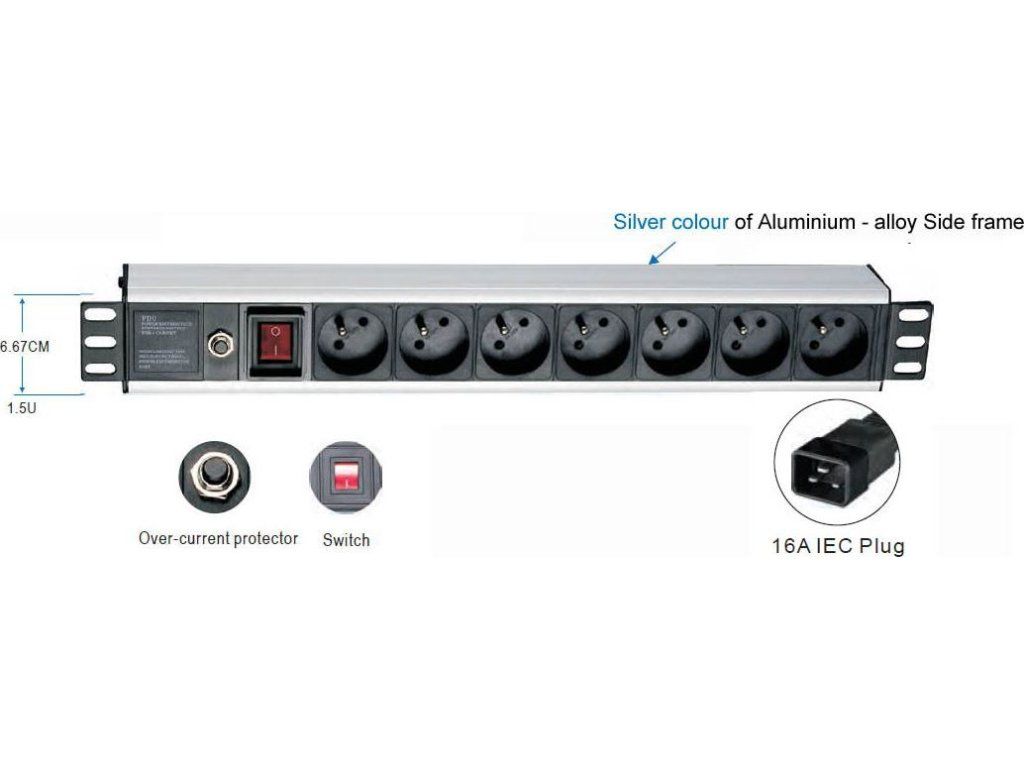 19" rozvodný panel 1,5U, 7x 220V napájecí kabel s koncovkou IEC 16A (230V/M 16A C19, IEC60320), koncovka C19Délka napájecího kabelu je 1,8 metru.