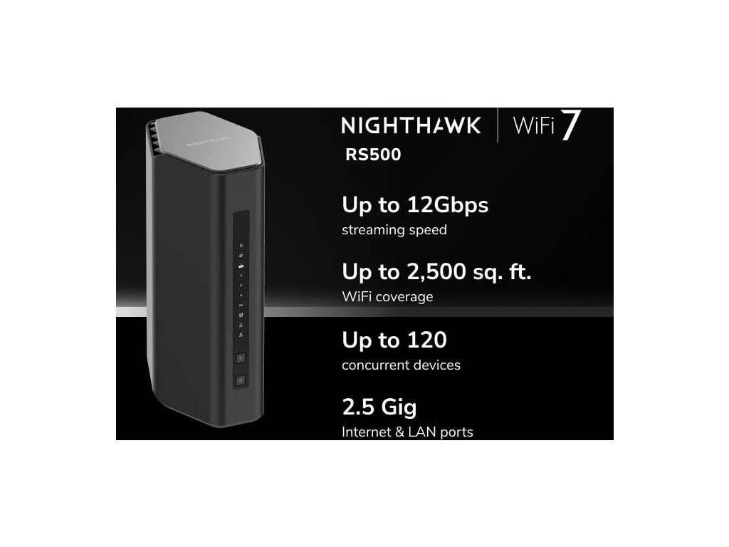 WiFi 7 od lídra v oblasti inovací WiFi - Nighthawk WiFi 7 je postaven na více než 25 letech průkopnických inovací a precizně navržen podle přísných standardů kvality společnosti NETGEAR, takže můžete využívat všech výhod, které WiFi 7 nabízí. Bleskurychlá WiFi -Bleskurychlá WiFi 7 s rychlostí až 12 Gb/s pro hraní her, plynulé streamování, videokonference a zábavu. Větší kapacita pro datově náročné činnosti - Připojte až 120 zařízení, jako jsou bezpečnostní kamery, chytrá domácí zařízení a reproduktory, a užívejte si streamování videa v rozlišení 4K/8K, online hraní a videokonference. Vícegigové rychlosti s internetovým portem 2,5GbE- Využijte 2,5Gigový internetový port pro kabelové a optické tarify s rychlostí až 2,5 Gb/s. Kompatibilní s jakýmkoli poskytovatelem internetových služeb. Kabelový port 2,5 GbE a další - Připojte kabelová zařízení a zvyšte výkon prostřednictvím 2,5Gb/s ethernetového portu LAN a tří 1Gb/s ethernetových portů LAN. Světelně rychlý výkon - 6GHz WiFi pásmo 1 poskytuje další vysokorychlostní komunikaci pro zvýšení výkonu. Rozsáhlé pokrytí-Ultra výkonné anténní pole poskytuje pokrytí až 3 000 čtverečních stop. Aplikace Nighthawk App-Snadné nastavení routeru, správa sítě odkudkoli, pozastavení internetu na připojených zařízeních, rychlý test rychlosti internetu, sledování využití internetových dat, nastavení oddělených sítí pro hosty a další funkce. Rozsáhlé funkce-Pomocí rozhraní USB 3.0 můžete sdílet soubory s libovolnými připojenými zařízeními, používat síť VPN pro zabezpečený vzdálený přístup k domácí síti a další funkce.Více informací na stránkách výrobce: https://www.netgear.com/uk/home/wifi/routers/rs500/#twister-list