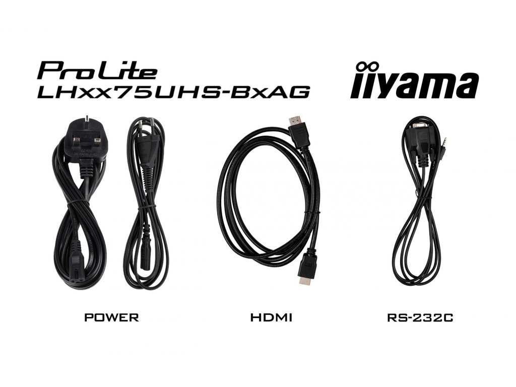 Obsah balení: napájecí kabel (1,8m), HDMI (1,8m), RS-232c (1,8m), uživatelský manuál, instrukce bezpečnosti, samolepky pro montážní otvory, drátěné přezky, dálkové ovládání (včetně baterie)