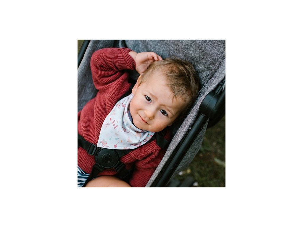 Bryndáček je vyroben z dvouvrstvé 100% bavlny, takže měkce obepíná krk miminka. Šátek je oboustranný a dostupný v mnoha barvách a vzorech. Snadno ji sladíte s outfitem vašeho batolete.