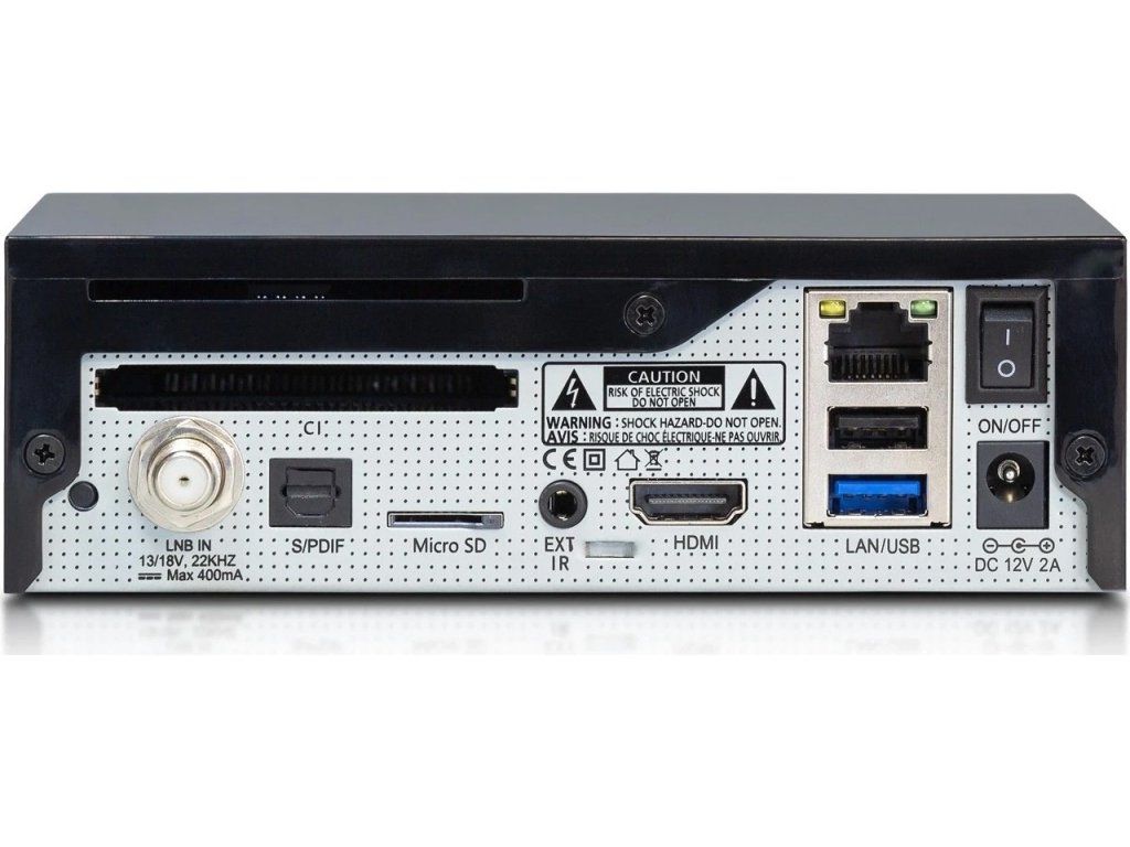 Elegantný a minimalistický dizajn prijímača sa bude hodiť do každej obývačky. Na prednom panely sa nachádza LED stavová dióda, ktorá signalizuje či je prijímač zapnutý, vypnutý alebo v stand-by režime. Intenzitu si viete nastaviť, prípadne úplne vypnúť. Na zadnom panely sa nachádza vstavaný satelitný tuner DVB-S2X, 1x slot pre čítačku kariet, 1x slot pre CI modul, 1x slot pre microSD kartu, 1x USB 3.0, 1x USB 2.0. Z konektorovej výbavy tu nájdete aj S/PDIF optický digitálny audio výstup, ethernet RJ45, IR extender pre pripojenie IR oka (nenachádza sa v balení prijímača), vypínač a vstup pre externý zdroj DC 12V-3A.