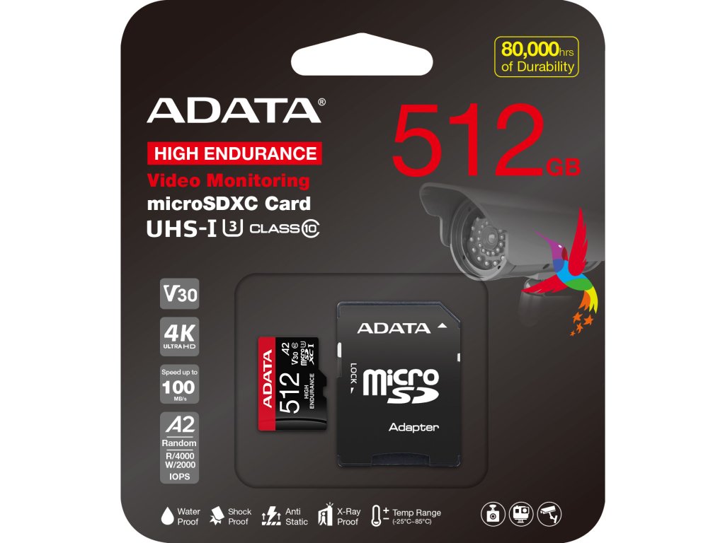 Paměťové karty ADATA High Endurance microSDXC/SDHC UHS-I jsou paměťové karty s vysokou odolností a rychlostní třídou videa 30 (V30), které jsou speciálně navrženy pro nepřetržité nahrávání a neustálé opakované nahrávání. Jsou ideální pro autokamery a sledovací systémy. Navíc díky klasifikaci Application Performance Class 2 (A2) mohou uživatelům poskytnout rychlejší a plynulejší práci s aplikacemi.