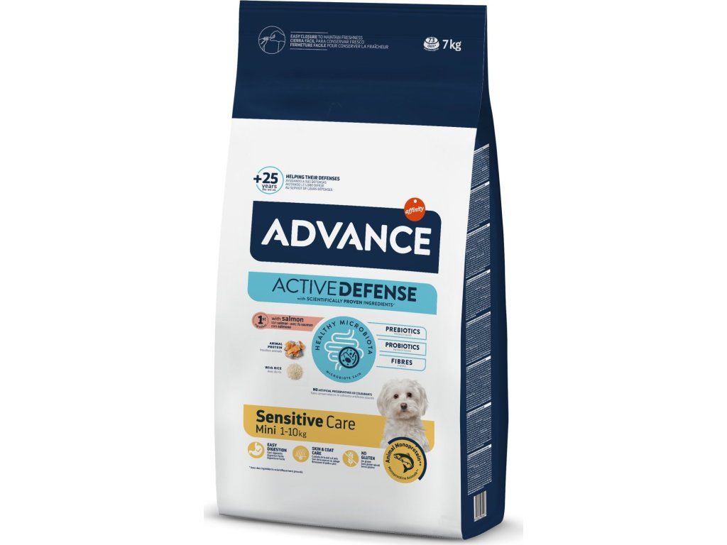 Krmivo Advance Adult Mini Sensitive Care je speciálně určeno k podpoře trávení malých psů. Vyrobeno z lososa jako jediného zdroje živočišných bílkovin a s rýží. Receptura s živočišnými monoproteiny, která je lehce stravitelná a jejíž složení neobsahuje složky obsahující lepek, sóju nebo vejce. Přispívá také ke zdravé kůži a lesklé srsti díky omega 3 a omega 6 mastným kyselinám.