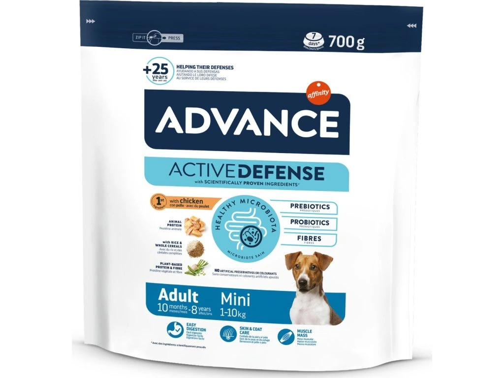 Advance Adult Mini je vysoce kvalitní krmivo, které je lehce stravitelné a jehož složení odpovídá potřebám dospělých psů malých plemen. Vyrobeno z kuřecího masa jako první složky. Pomáhá udržovat svalovou hmotu díky obsahu vysoce kvalitních bílkovin a přispívá ke zdravé kůži a lesklé srsti díky omega 3 a omega 6 mastným kyselinám. Granule mají menší velikost, aby se vešly do tlamy malých psů.