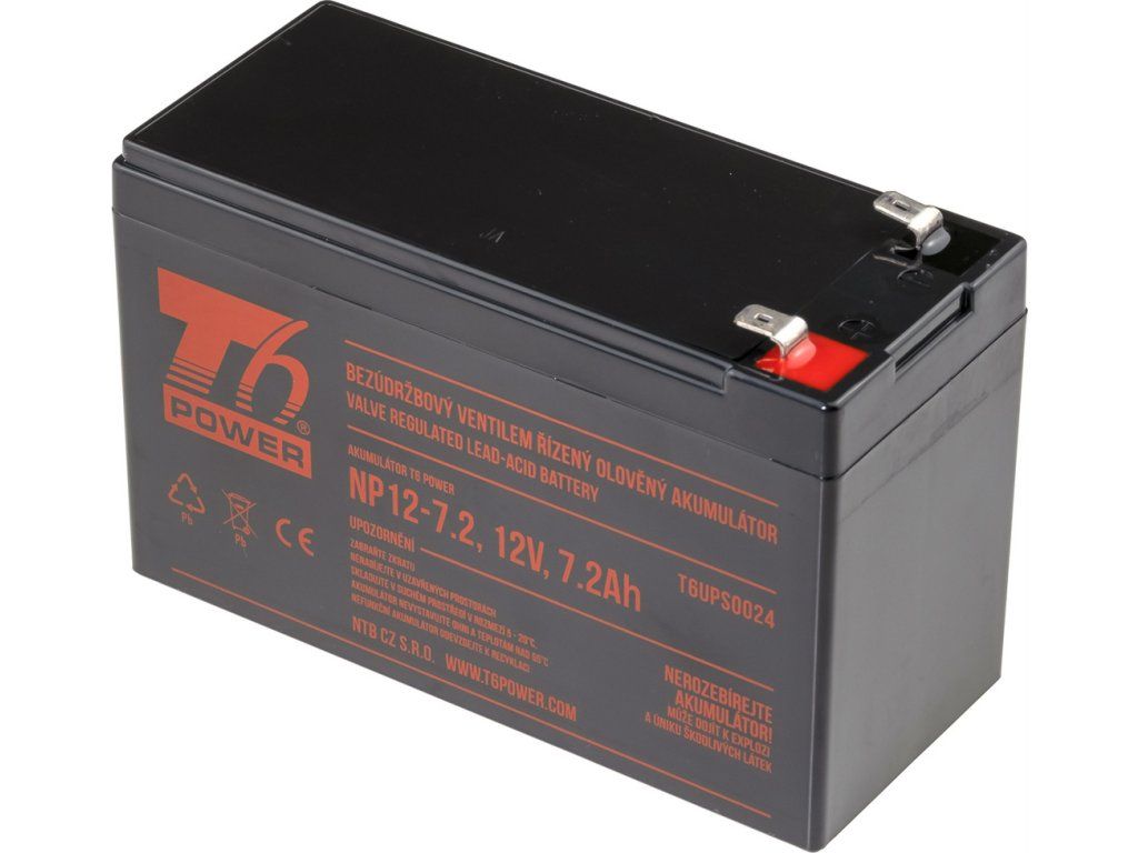 Akumulátor české značky T6 Power NP12-7.2 poskytne připojenému zařízení prostřednictvím konektoru Faston 2 napětí 12 V při kapacitě 7,2 Ah. Akumulátor je vyrobený z odolného ABS plastu, který je nárazuvzdorný, odolný vůči vyšším teplotám. Díky konstrukci akumulátoru je možné jej používat v libovolné pozici. Zároveň je akumulátor odolný vůči hlubokému vybíjení.