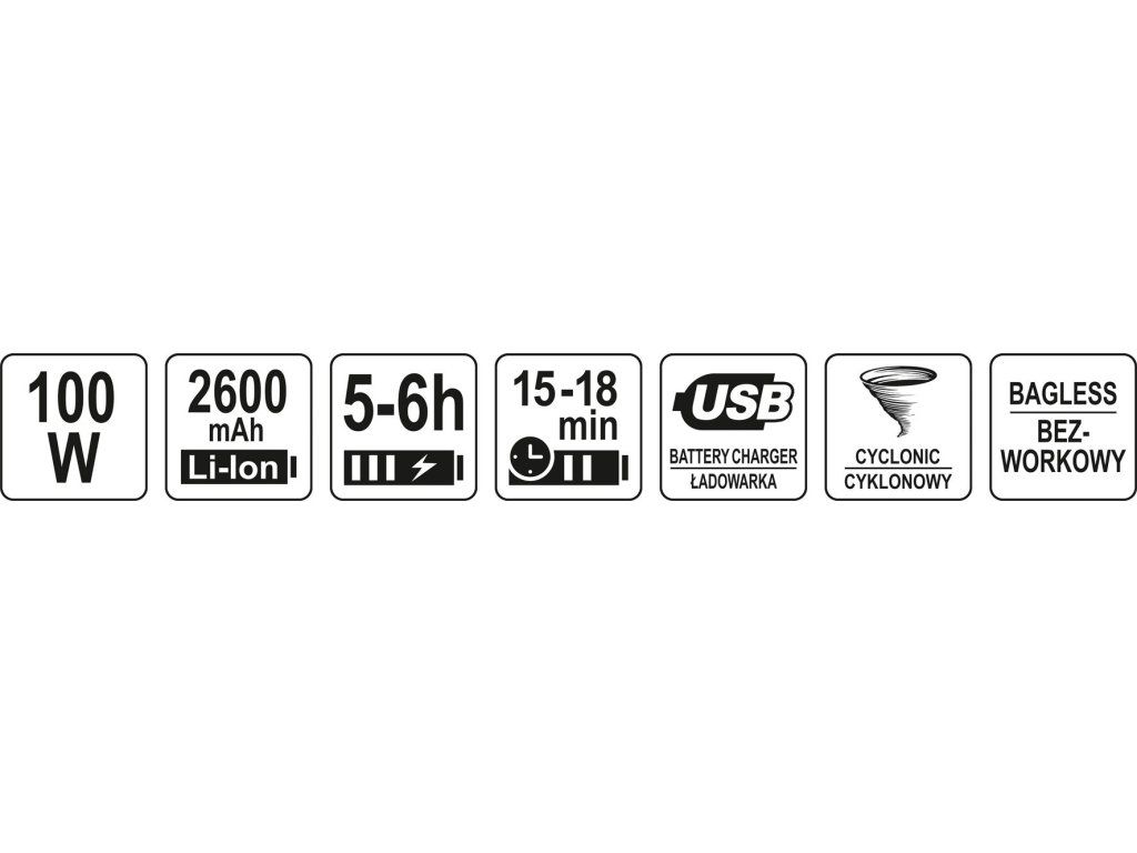 Obsah balení: vysavač 100W s HEPA filtrem turbo kartáč se 4 LED světly štěrbinová hubice kulatý hrot se štětinami látkový sáček USB kabel 120 cm flexibilní hadice 65 cm| Technická data | |