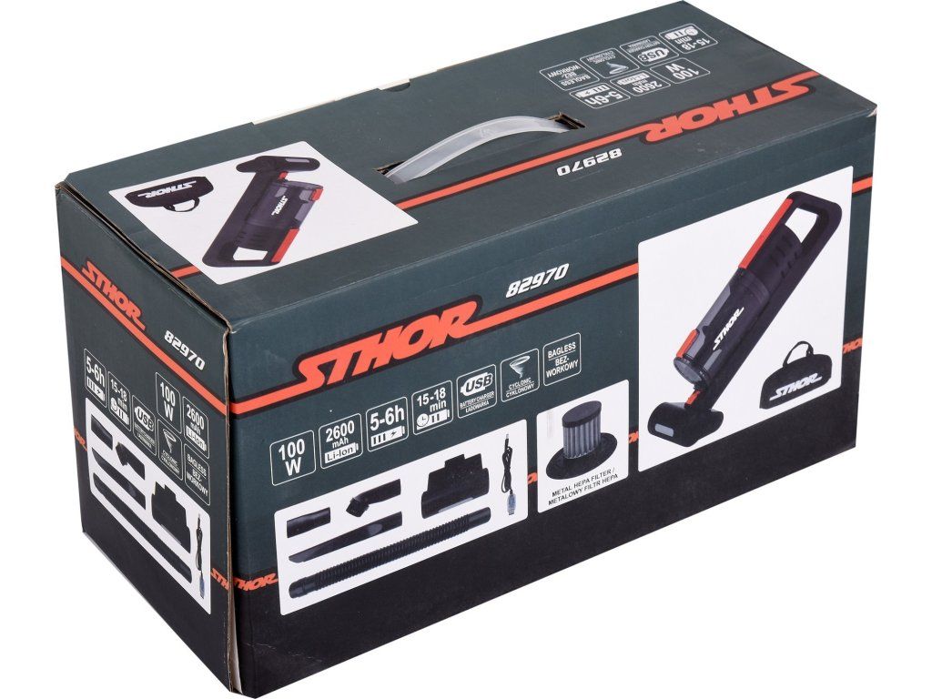 Kovový HEPA filtr zaručuje efektivní filtraci vzduchu a redukci škodlivin. Výkonná Li-Ion baterie 2 600 mAh umožňuje nepřetržitý provoz až 15–18 minut. Ideální pro vysávání osobních a nákladních automobilů a jako další domácí vysavač.