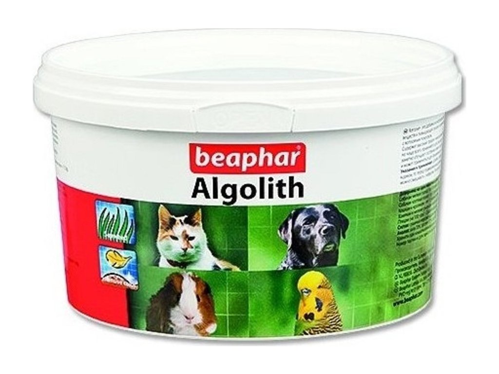 Algolith je čistou přírodní moučkou z mořských řas, která pomáhá dosažení přirozené barvy srsti, očí a nosu. Čistý přírodní produkt s vysokým obsahem stopových prvků a vitamínů. Přidávejte k denní krmné dávce. Dodržujte doporučené dávkování. Pokud krmíte psa granulemi, navlhčete je před použitím doplňku, např. vodou, konzervou či lososovým/rostlinným olejem. Zajistěte přístup k čerstvé, pitné vodě.Dávkování: - pes (malá plemena) - 1/2 čajové lžičky (2,4g), - pes (střední plemeno) 1 čajová lžička (4,8g), - pes (velké a obří plemeno) 1 polévková lžíce (17,0g), - kočka a králík 1/3 čajové lžičky (1,8d), - křeček a jiný malý hlodavec na špičku nože (0,1g), - pták (na 100g krmiva) 2 špičky nože (0,2g).Deklarované jakostní znaky: hrubý protein 9,5%, hrubá vláknina 5,5%, hrubé oleje a tuky 0,7%, hrubý popel 28,0%, vlhkost 8,0%, draslík 7,3%, sodík 3,3%, vápník 1,4%, hořčík 0,7%, fosfor 0,3%.