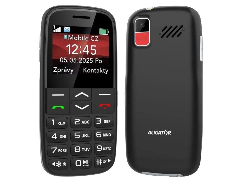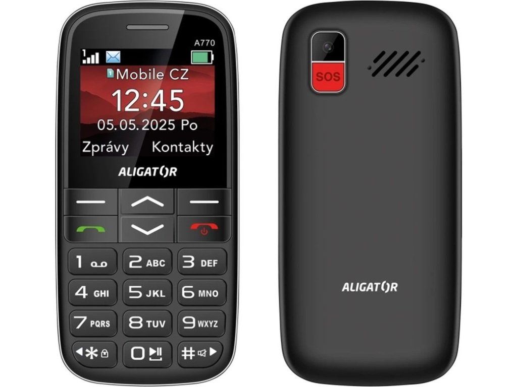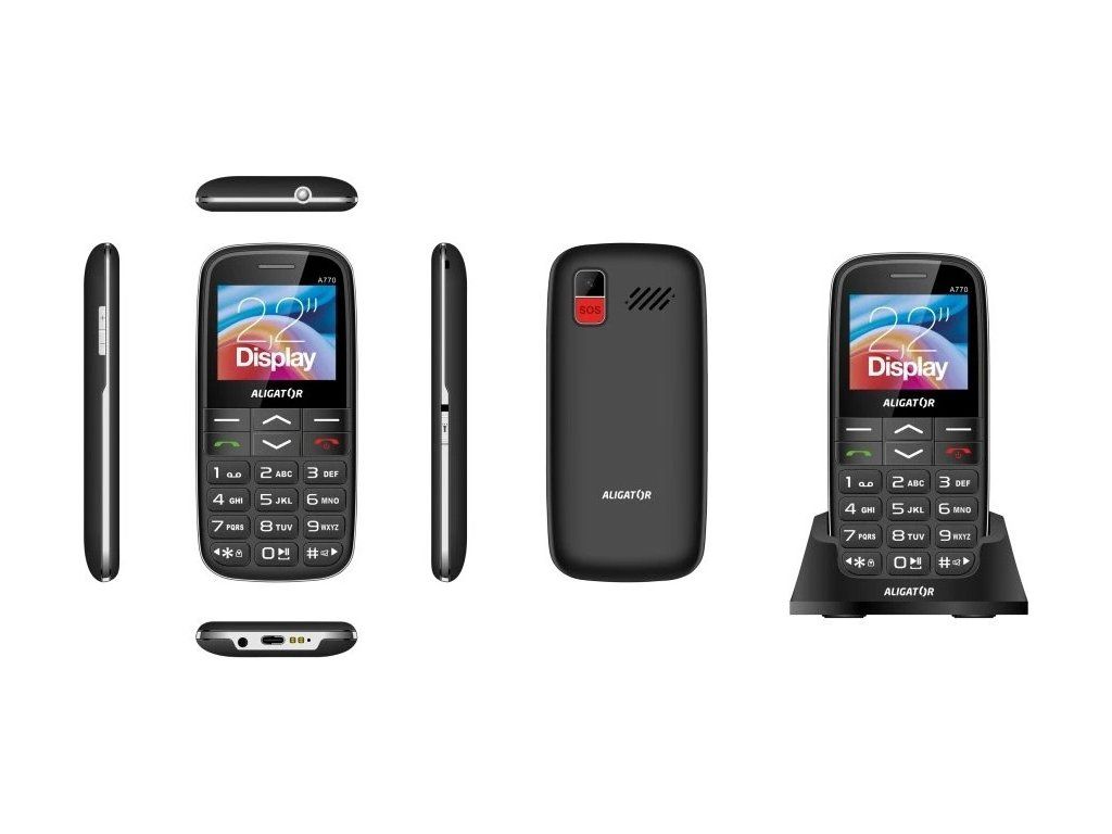 Obsah balení: Telefon Aligator A770, nabíjecí stojánek, návod k použití (bez nabíječky)