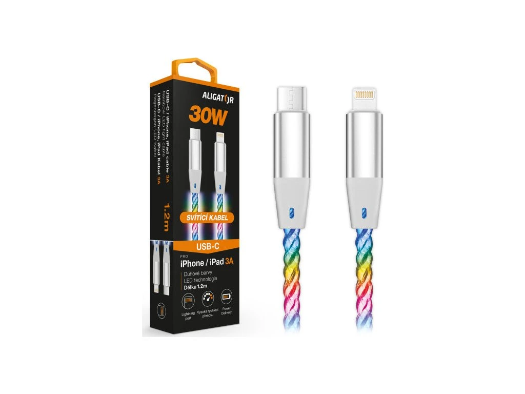 Duhově svítící LED kabel řady ALIGATOR POWER s kovovými konektory USB-C/Lightning nejvyšší kvality, o výkonu 30W a možností nabíjení až 3A.