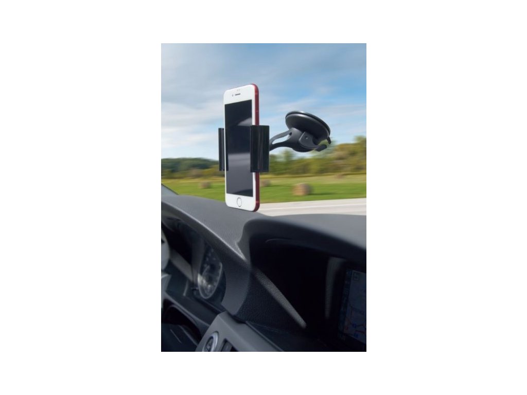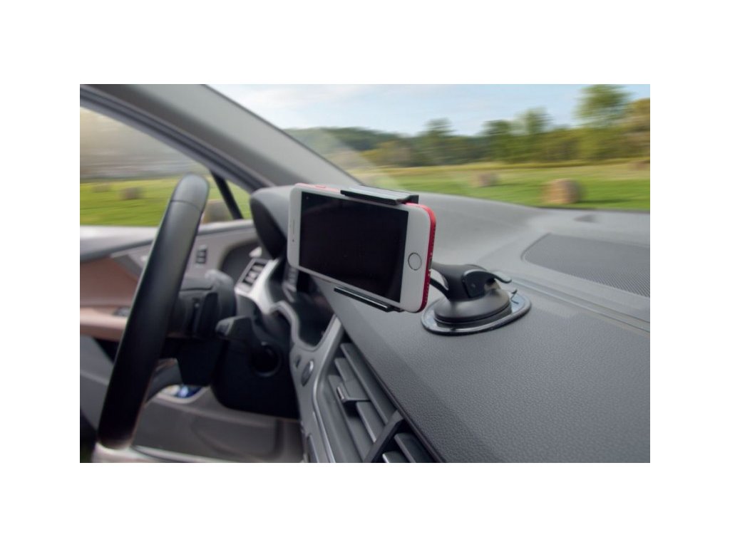 Univerzální držák pro mobilní telefony s uchycením pomocí přítlačných roztahovacích ramen. Díky tomuto přítlačnému systému lze ovládat jednou rukou. Možnost natočení mobilního telefonu v plném rozsahu 360°. Držák lze umístit na čelní sklo, ale i na palubní desku s pomocí speciální nano-podložky v balení.