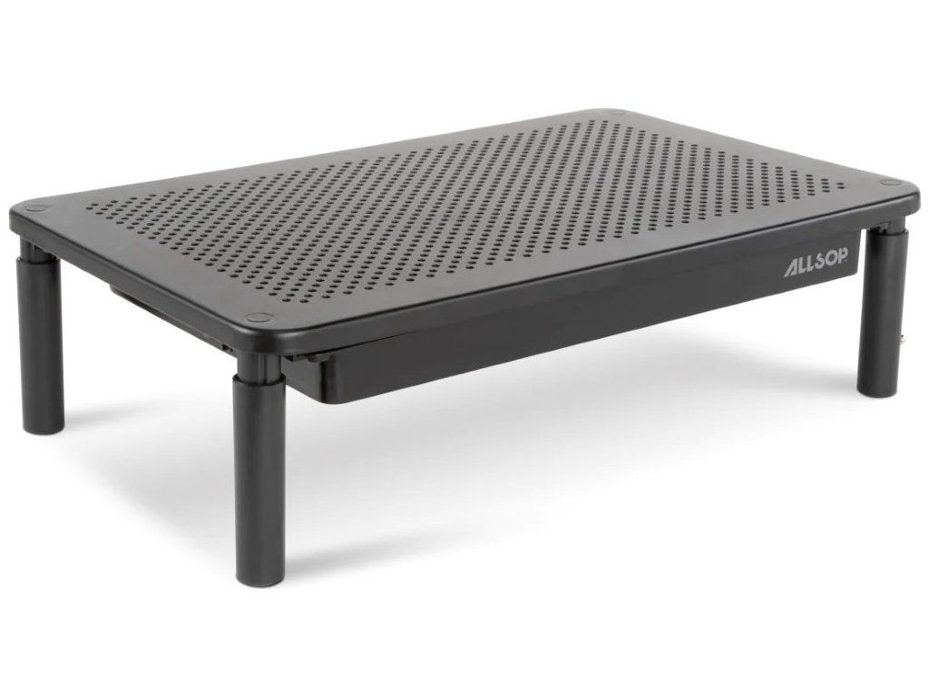 Trojúrovňový stojan na monitor Allsop Metal Art má odolnou kovovou platformu s práškovým nástřikem s perforovanými otvory s mikrotečkami a podporuje monitory až do hmotnosti 35 lb a 27 palců. Teleskopické nohy umožňují uživatelům vybrat si ze tří úrovní výšky (4,13 palce, 5,0 palce nebo 5,75 palce) pro ideální ergonomický komfort. Integrovaná úložná zásuvka je ideálním místem pro další zásoby a má slot pro telefon pro snadný přístup.