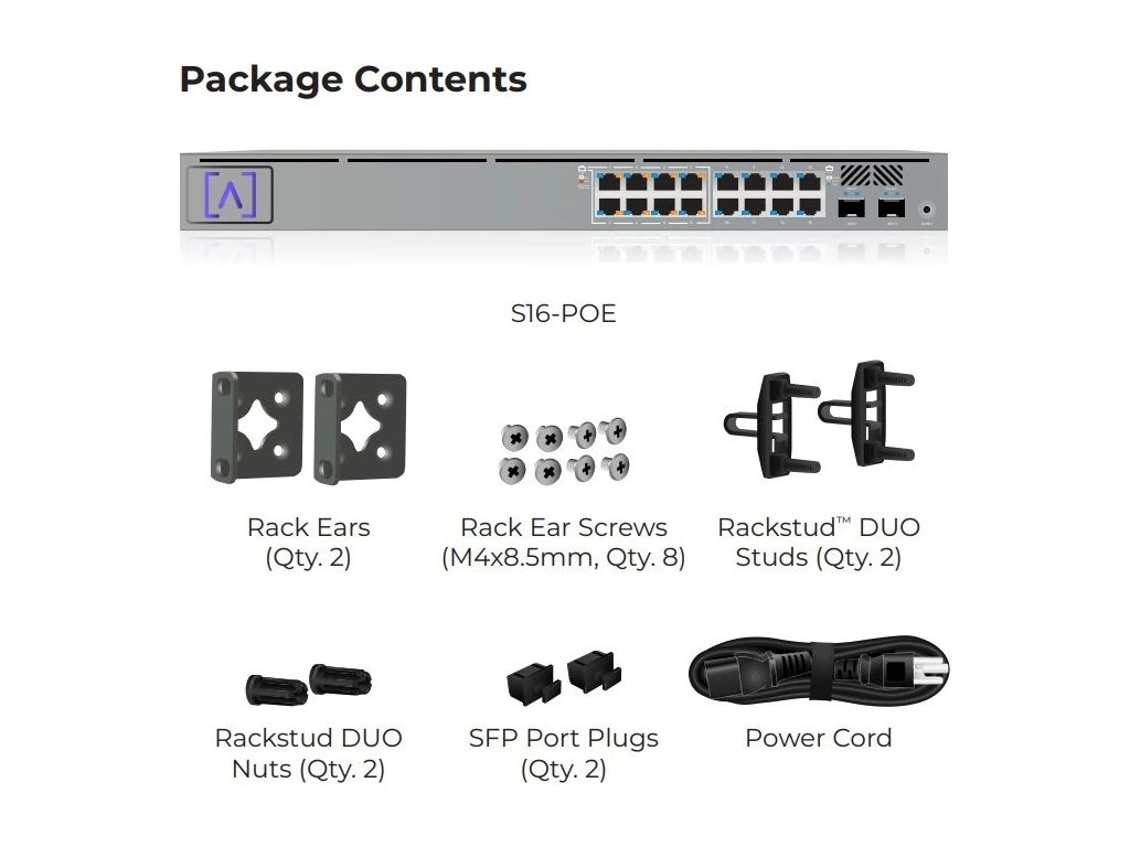 ALTA Switch 16 POESwitch nabízející 16 GbE RJ-45 portů, z nichž 8 podporuje PoE+ (802.3at) s celkovým napájecím výkonem až 120 W, a 2 SFP porty. Přepínací kapacita dosahuje až 36 Gbps a rychlost směrování až 26,8 Mpps. Součástí balení jsou držáky pro uchycení do racku.