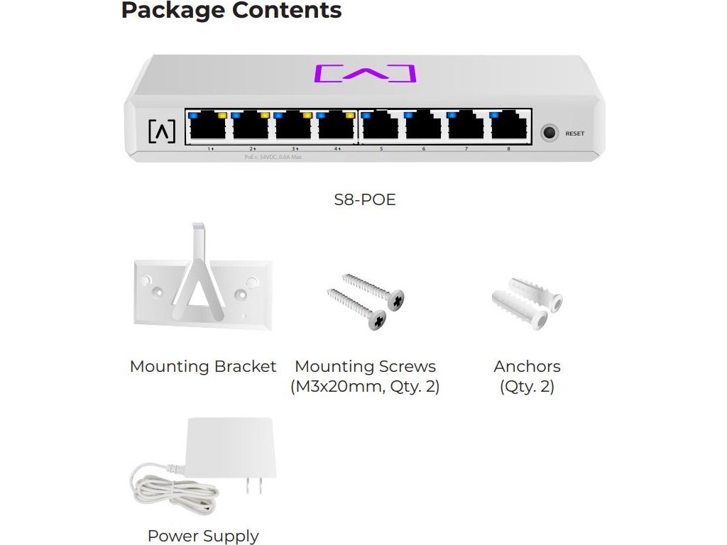 ALTA Switch 8 POESwitch nabízející 8 GbE RJ-45 portů, z nichž 4 podporují PoE+ (802.3at) s celkovým napájecím výkonem až 60 W. Přepínací kapacita dosahuje až 16 Gbps a rychlost směrování až 11,9 Mpps. Součástí balení je držák pro uchycení na stěnu.