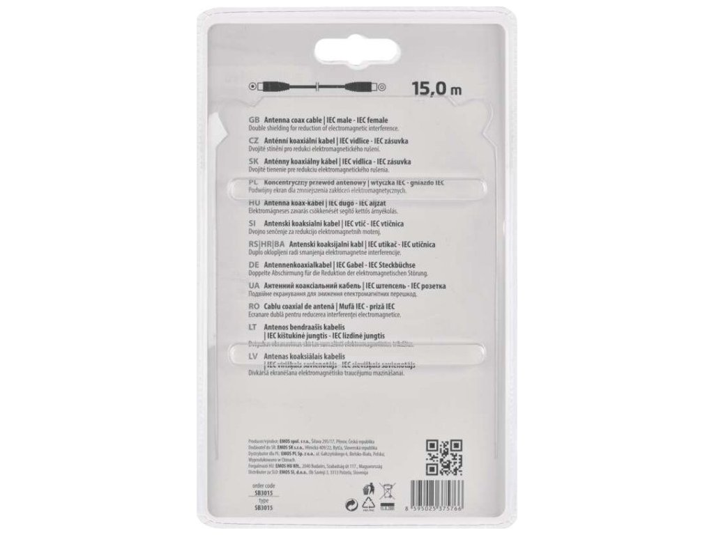 Anténní koaxiální kabel s vidlicí a zásuvkou IEC. Kabel má dvojité stínění pro redukci elektromagnetického rušení. Délka kabelu je 15 m. Koaxiální kabel je vhodný pro SAT, DVB-T, ANT, DECODER, FLAT TV a TV.