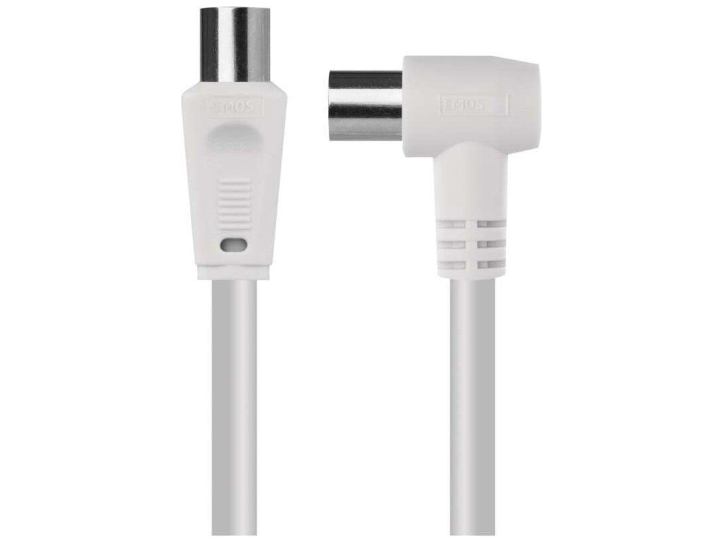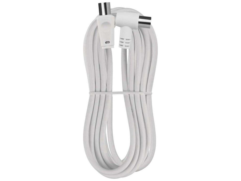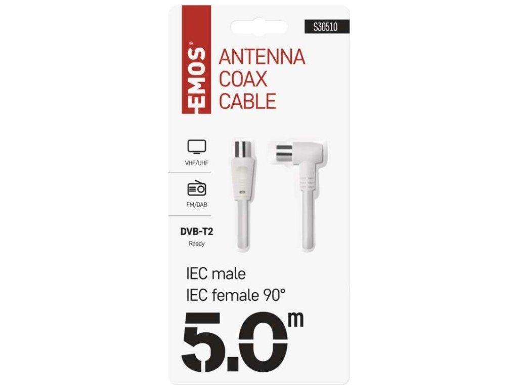 Anténní koaxiální kabel s vidlicí a zásuvkou IEC. Kabel má úhlový konektor (90°). Kabel má dvojité stínění pro redukci elektromagnetického rušení. Délka kabelu je 5 m. Koaxiální kabel je vhodný pro SAT, DVB-T, ANT, DECODER, FLAT TV a TV.
