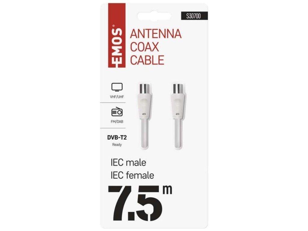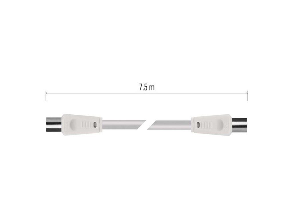 Anténní koaxiální kabel s vidlicí a zásuvkou IEC. Kabel má dvojité stínění pro redukci elektromagnetického rušení. Délka kabelu je 7,5 m. Koaxiální kabel je vhodný pro SAT, DVB-T, ANT, DECODER, FLAT TV a TV.