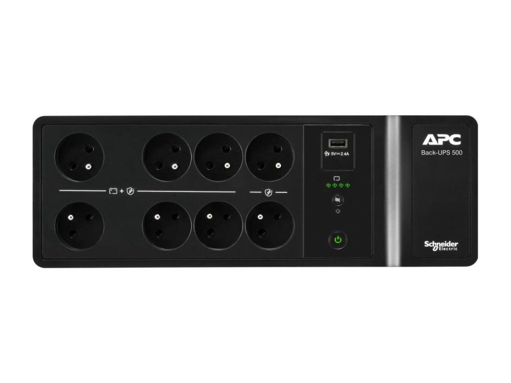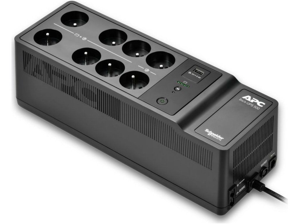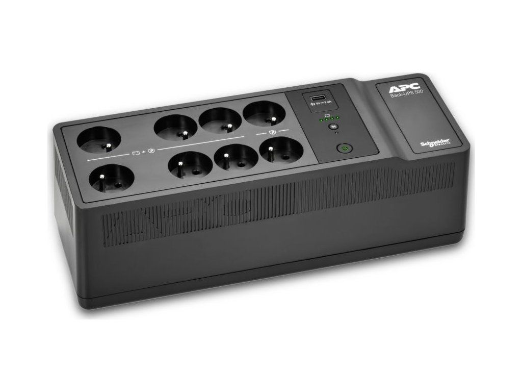 APC Back-UPS 500 VA/300 W (BE500G2-FR)Záložní zdroj pro montáž na podlahu/stěnu umožňuje připojení až osmi zařízení pomocí zásuvek francouzského typu a všechny je chránit proti přepětí, šest z nich je navíc bateriově zálohovaných. Přepěťová ochrana je též dostupná pro internetovou síť. UPS je vybavena LED signalizací, informující o jejím stavu. K dispozici je také port USB, s jehož pomocí lze nabíjet mobilní zařízení včetně chytrých telefonů a tabletů. Díky svým malým rozměrům je záložní zdroj vhodný do domácnosti i kanceláře.