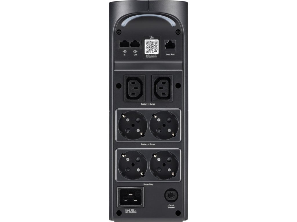 APC Back-UPS Pro 2200 VAVěžový záložní zdroj o výkonu 1320 W má celkem 6 zásuvek, z nichž 3 jsou záložní baterie a přepěťová ochrana a 3 jsou pouze přepěťovou ochranou. Disponuje čtyřmi Schuko zásuvkami a dvěma IEC 320 C13 konektory. Pro snadné ovládání je vybaven LCD displejem s RGB osvětlením. Automatická regulace napětí (AVR) koriguje poklesy a rázy napětí na správnou úroveň. Potěší také přítomnost 2× USB a 1× USB-C, které poskytují napájení celkem až 15 W pro nabíjení mobilních zařízení. Ke správě jednotky slouží RJ-45 data port.