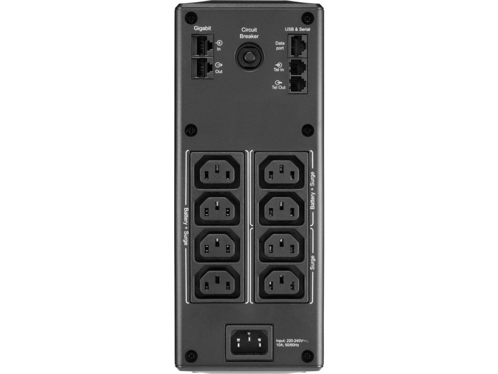 Výstupní přípojky: (6) IEC 320 C13 (Záložní provoz na baterie), (2) IEC 320 C13 (Přepěťová ochrana)