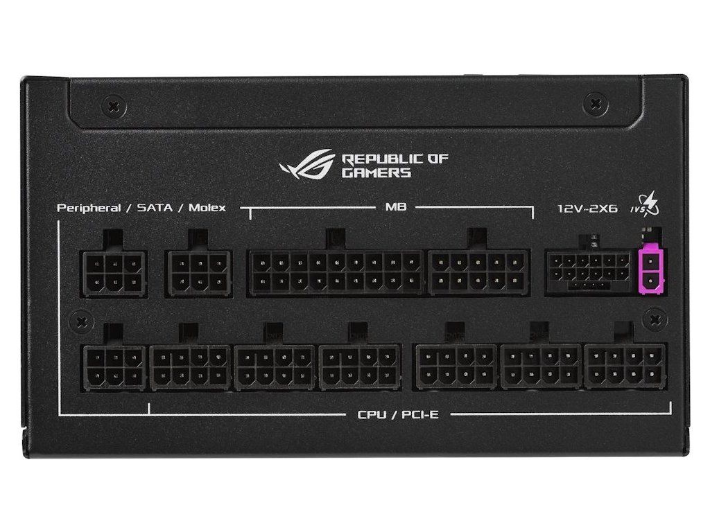 Zdroj je plně kompatibilní se standardem ATX 3.1 a disponuje nativním 12V-2x6 konektorem pro grafické karty PCIe 5.1 s výkonem až 600 W. Certifikace 80 PLUS Platinum a Cybenetics Platinum garantují špičkovou účinnost, zatímco Cybenetics Lambda A potvrzuje mimořádně tichý provoz pod 25 dB. Masivní ROG chladiče a 0dB technologie zajišťují téměř bezhlučný provoz při nižší zátěži.