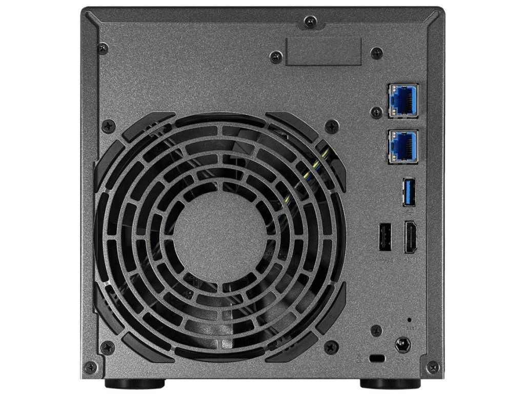 Zařízení je vybaveno dvěma 5gigabitovými Ethernet porty, které pomocí SMB Multichannel efektivně zdvojnásobují dostupnou šířku pásma a poskytují výkon srovnatelný s 10GbE za zlomek ceny. Pro rozšíření je k dispozici PCIe 3.0 slot kompatibilní s 10gigabitovými síťovými kartami. Konektivitu doplňují dva USB 3.1 porty (10 Gbps) a jeden USB 2.0 port pro pomalejší zařízení jako tiskárny nebo UPS. Pro lokální video výstup slouží HDMI 2.0b port.