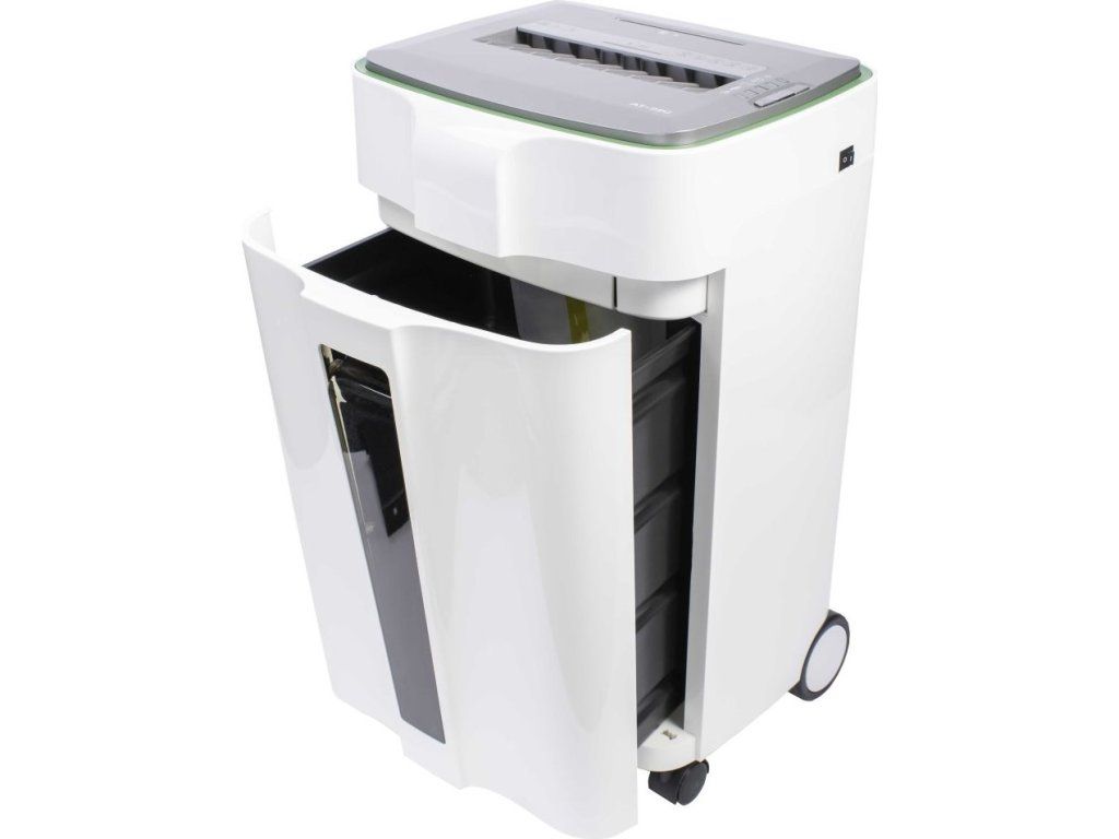AT skartovačka AT-22CSkartovací stroj atraktivního designu pro střední kanceláře. Je vhodný pro skartaci dokumentů o šířce až 230 mm. Stroj je standardně vybaven automatickým systémem start/stop, zpětným chodem, tepelnou pojistkou motoru proti přehřátí a signalizací přeplněného koše. Příležitostně lze skartovat sešívací sponky a díky oddělenému vstupu i kreditní karty a CD. Odpadní nádoba o objemu 30 l je vybavena průhledným okénkem pro optickou kontrolu. Praktická pojezdová kolečka usnadňují manipulaci.