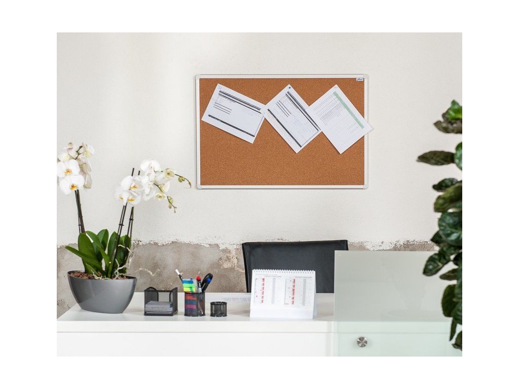 Korková nástěnka s hliníkovým rámem je moderním doplňkem domácností, kanceláří, škol nebo obchodů, kde vám pomůže s prezentací.
