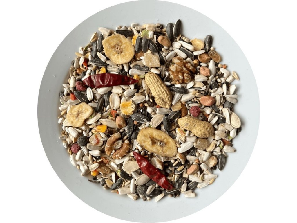 Krmný návod: Krmte dle potřeby. Zajistěte dostatek pitné vody.Složení: slunečnice, safrol, buráky, oves nahý a celý, pohanka, banány, kukuřice, dýně, cedrové ořechy, čirok, konopí, hrachové vločky, extrudované obiloviny, papája, mrkev, rozinky, chilli papričky.Analytické složky: hrubý protein 15,4%, hrubá vláknina 9,5%, hrubé oleje a tuky 18%.