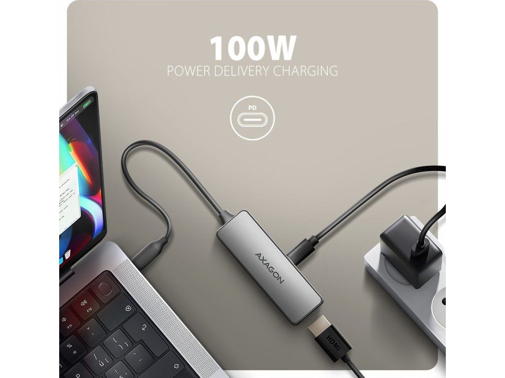 Unikátní vlastností tohoto video adaptéru je USB-C PD konektor, určený výhradně pro nabíjení telefonů a notebooků technologií Power Delivery 3.0 s výkonem až 100 W. Stačí připojit kompatibilní USB-C nabíječku s podporou Power Delivery a propojit video adaptér s notebookem. Tím nejen zajistíte nabíjení, ale zároveň uvolníte jeden USB-C port na notebooku pro další použití.