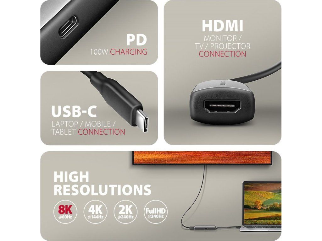 USB-C -> HDMI aktivní adaptér - redukce AXAGON RVC-HI8KPD pro připojení HDMI monitoru/TV/projektoru k notebooku, tabletu nebo telefonu s výstupem USB-C. Tato redukce vám umožní snadno využít váš stávající HDMI kabel k připojení zařízení jako Apple MacBook Air nebo Pro.