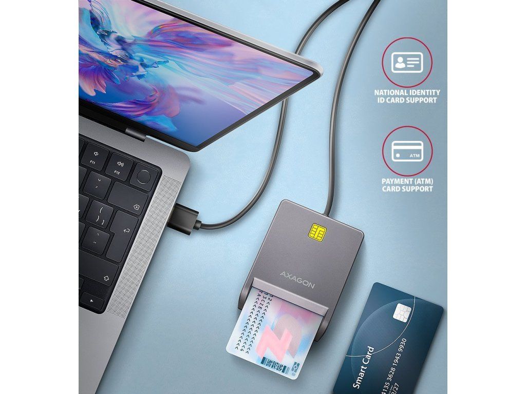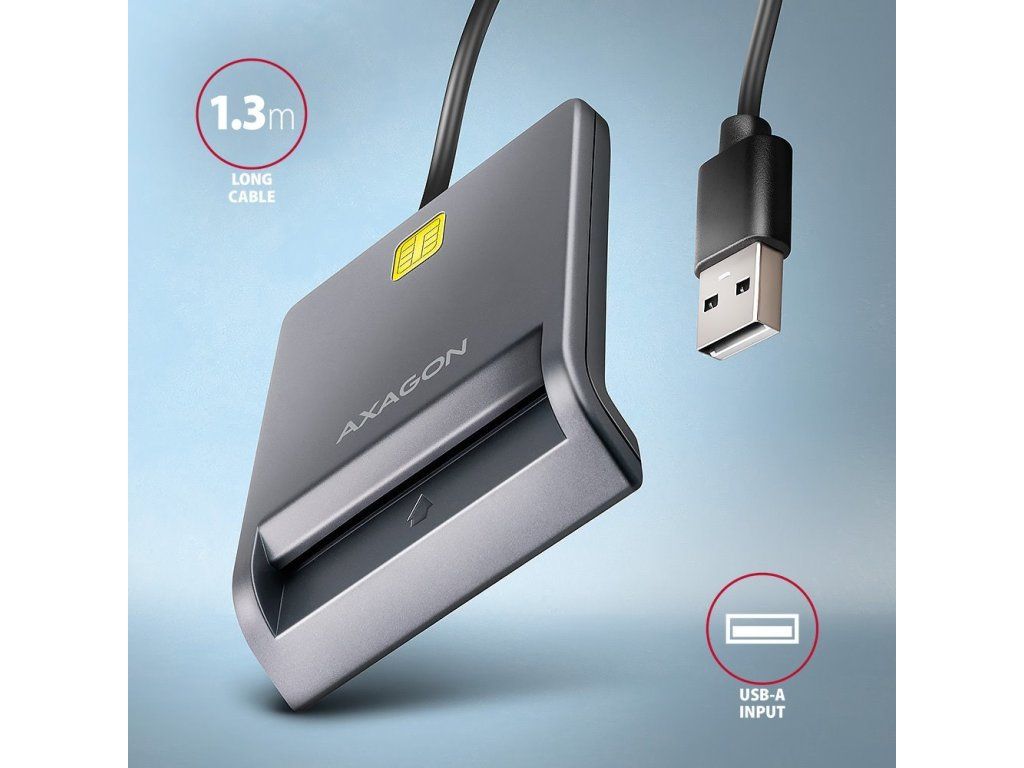 Kompaktní stolní čtečka karet AXAGON CRE-SM3T, pro kterou je práce s kartami a dalšími doklady s čipem hračkou. Díky rozhraní USB je kompatibilní s notebooky i stolními počítači bez ohledu na jejich stáří. Navíc díky řešení Plug & Play je během okamžiku připravena k použití. Čtečka AXAGON CRE-SM3T tak představuje ideálního pomocníka pro práci s elektronickým občanským průkazem a dalšími typy karet. Stačí jen připojit, vložit kartu a spustit příslušnou aplikaci.