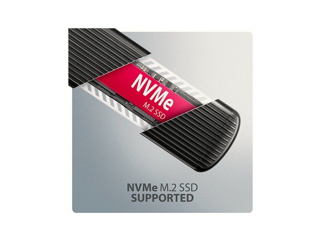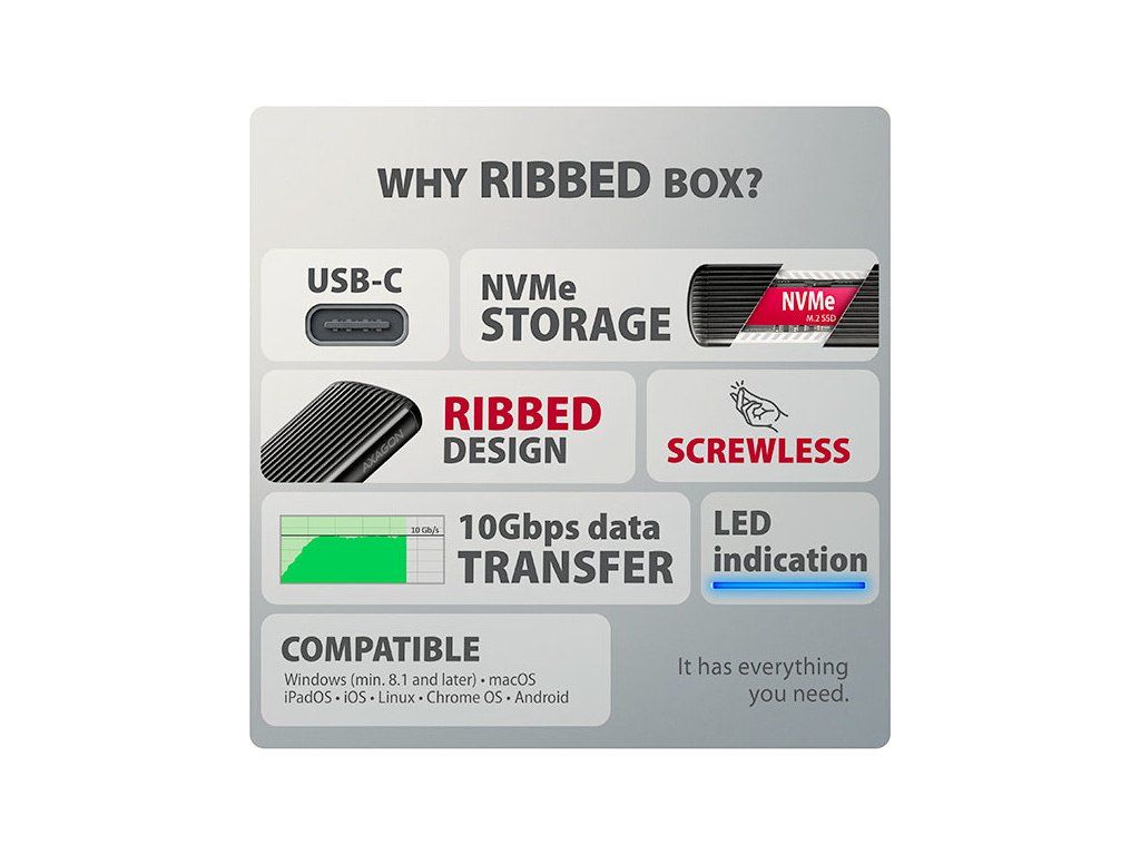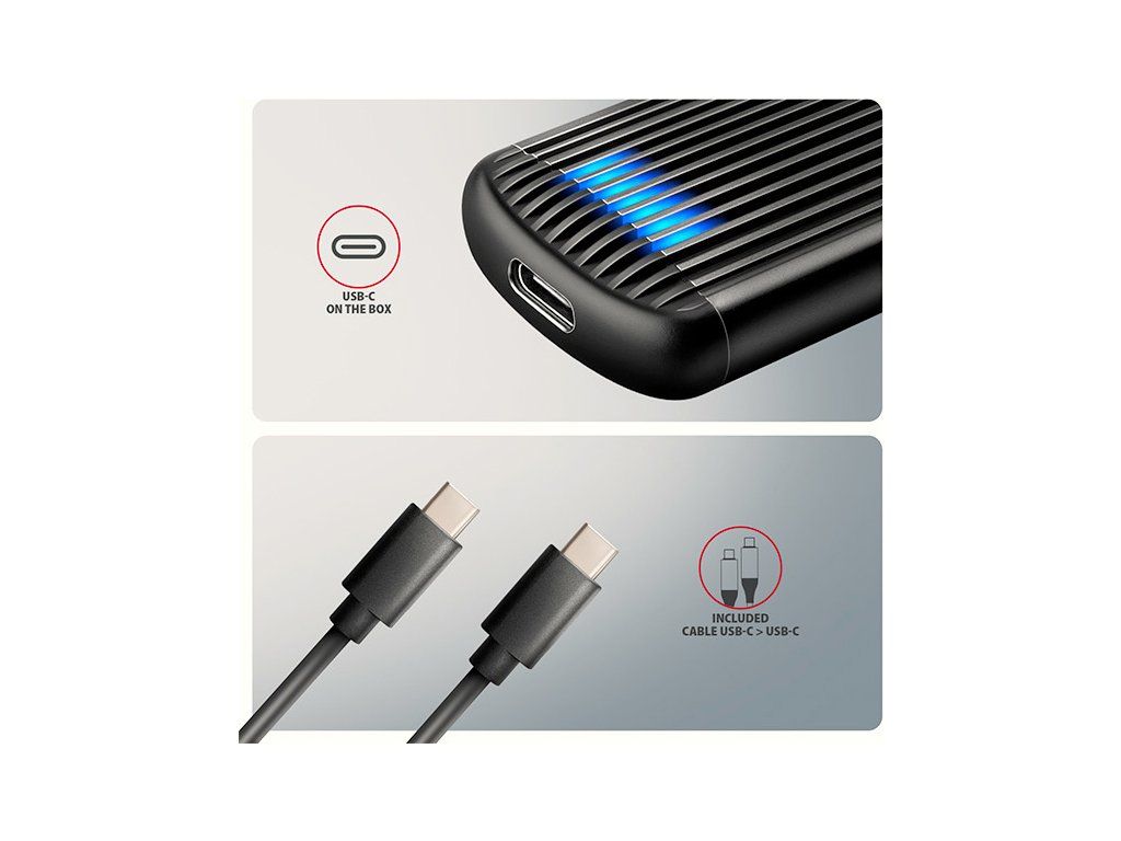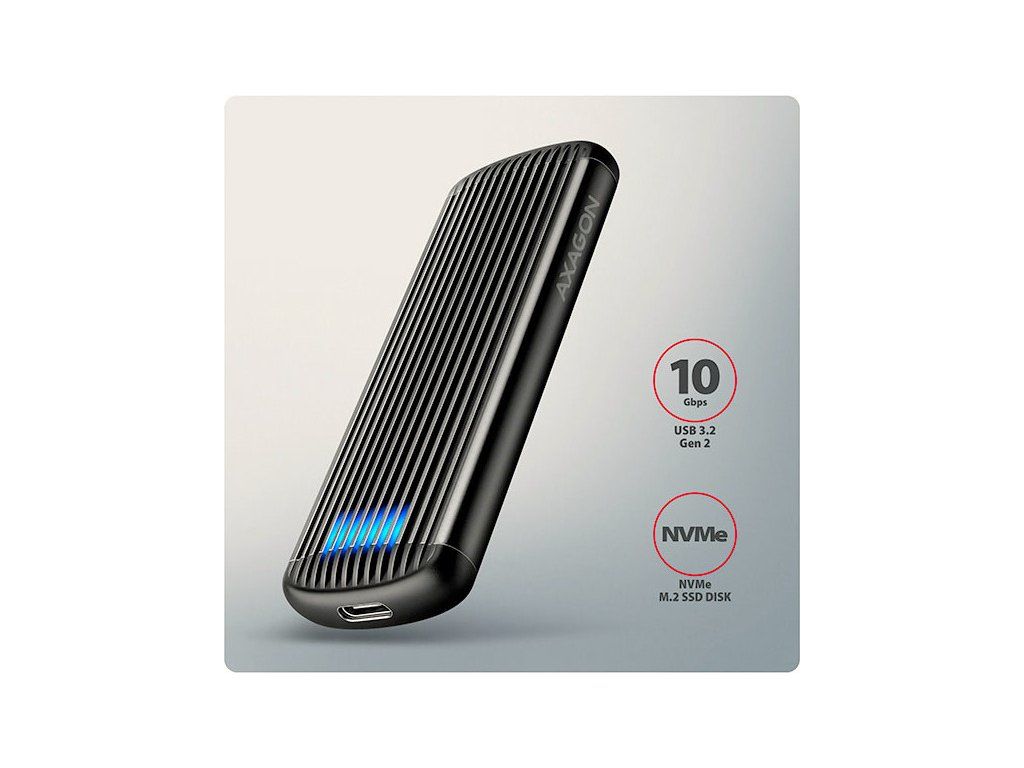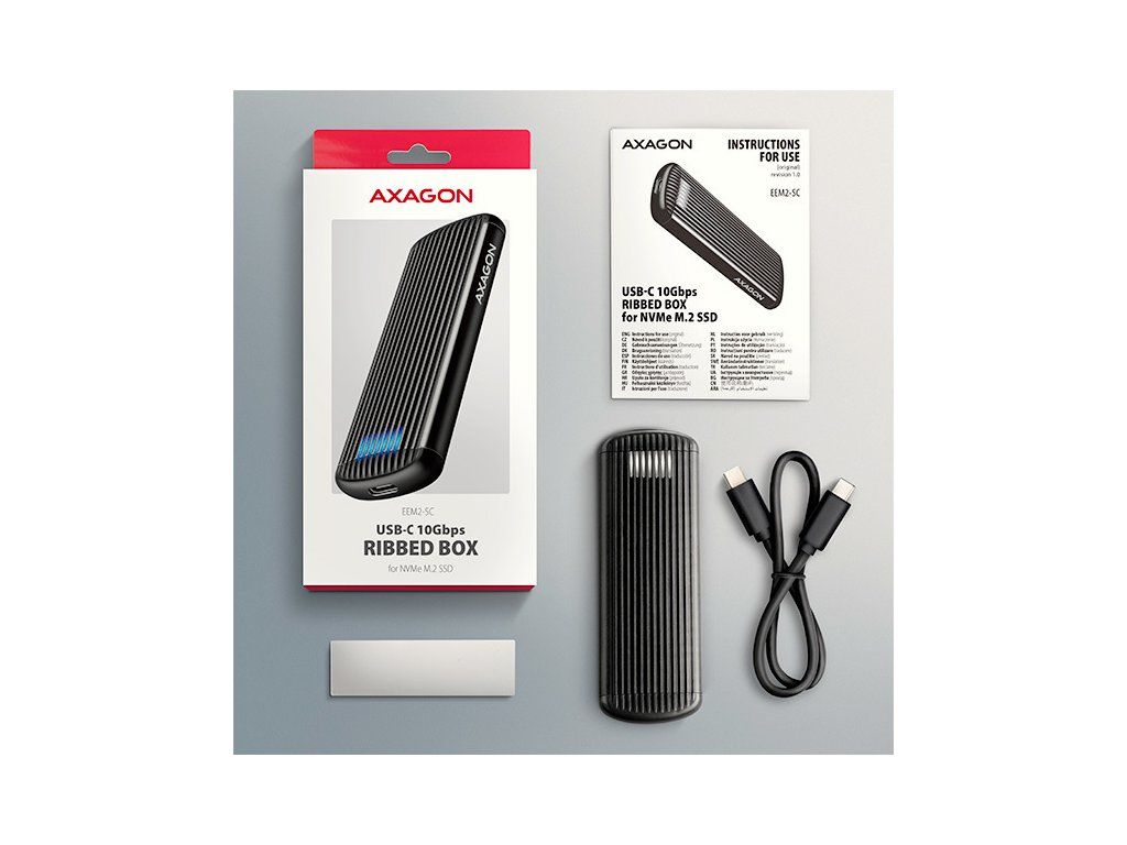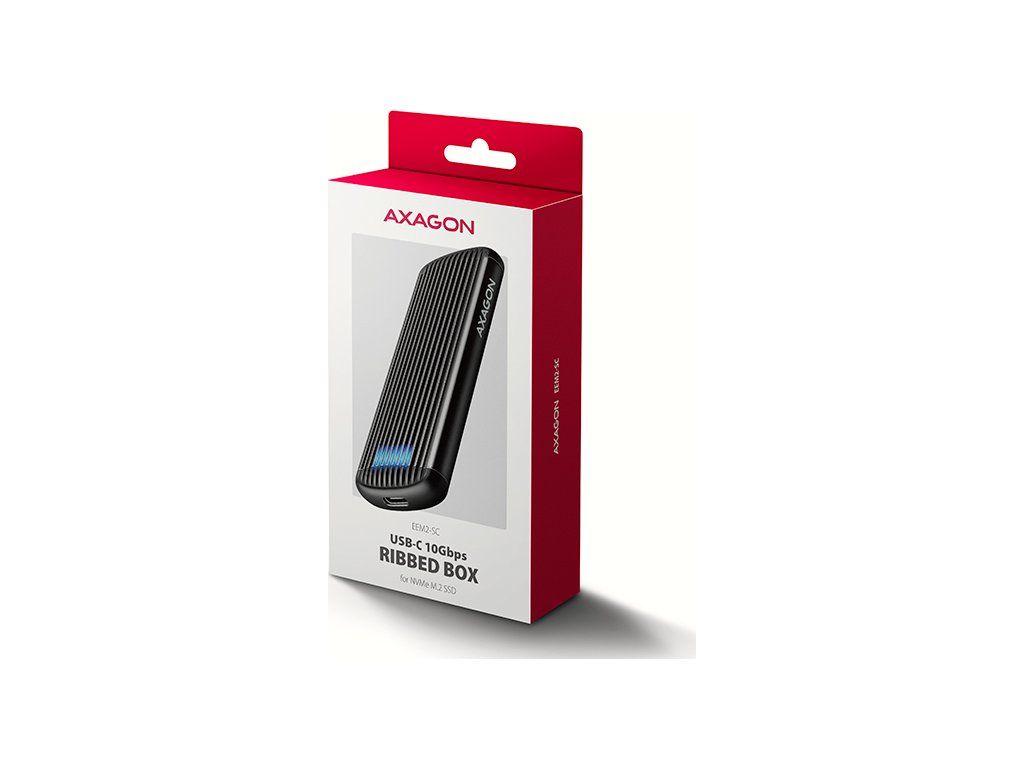 Hliníkový externí AXAGON EEM2-SC RIBBED box s USB 10Gbps rozhraním určený pro M.2 NVMe SSD disky. Stabilní a rychlé připojení zajišťuje oboustranný USB-C konektor. V balení naleznete kabel USB-C -> USB-C pro připojení boxu k počítači.