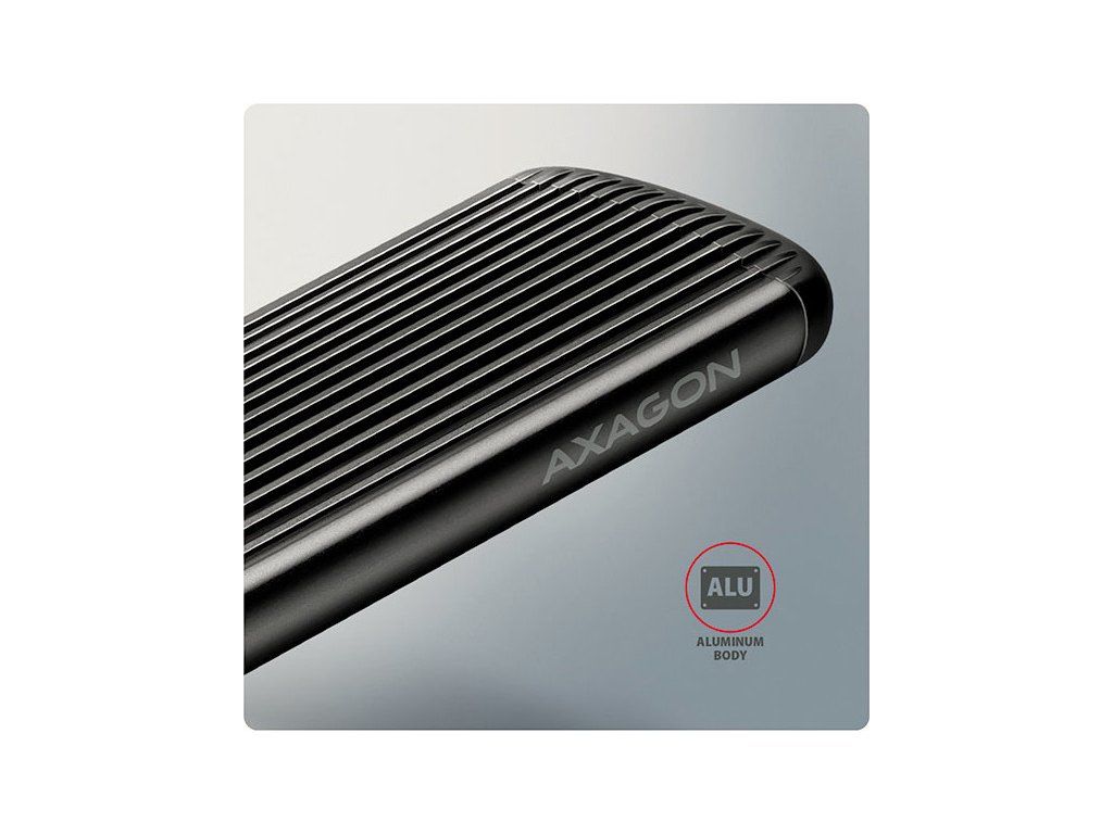 Žebrovaný design a hliníkový plášť boxu zajistí velmi dobré chlazení vloženého M.2 SSD disku. Prodlužuje se tak jeho životnost a také je zamezeno zpomalování rychlosti disku tzv. „Thermal Throttling“. Vnější kovový plášť je proveden v černé barvě a brání nežádoucím otiskům prstů.