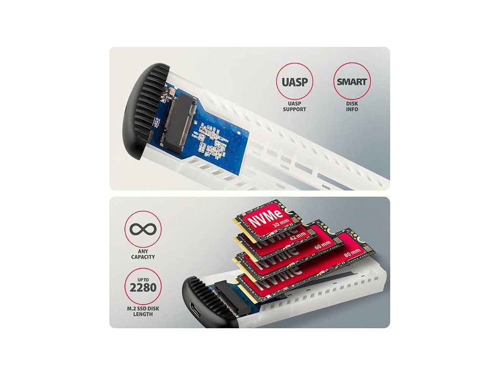 Díky USB 10Gbps rozhraní je přenosová rychlost až 10 Gb/s. Externí M.2 box podporuje moderní funkce např. UASP, TRIM a umožňuje čtení S.M.A.R.T. informací monitorujících stav disku.