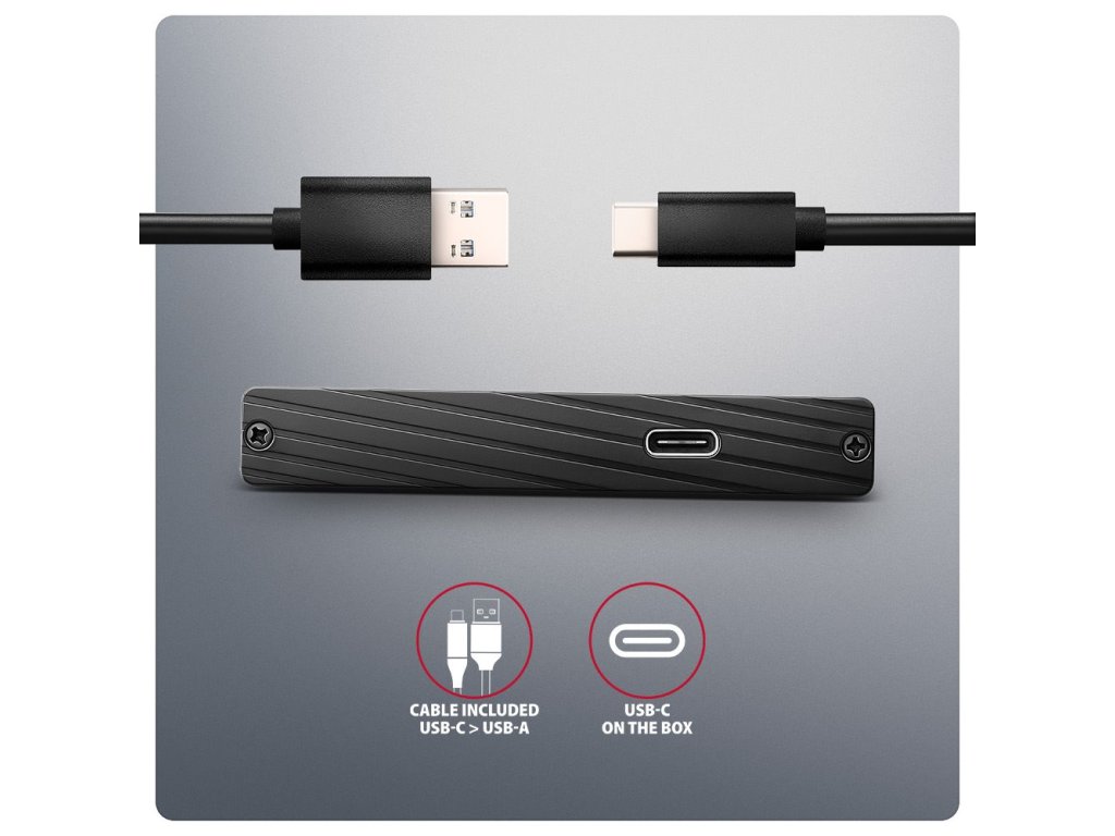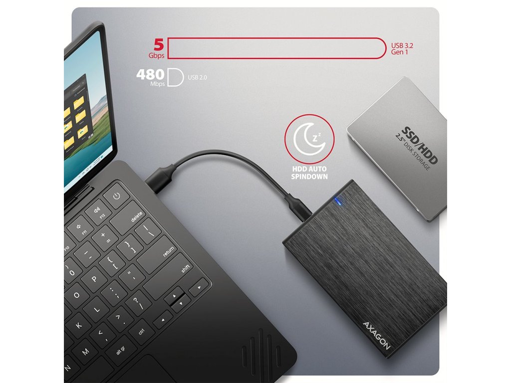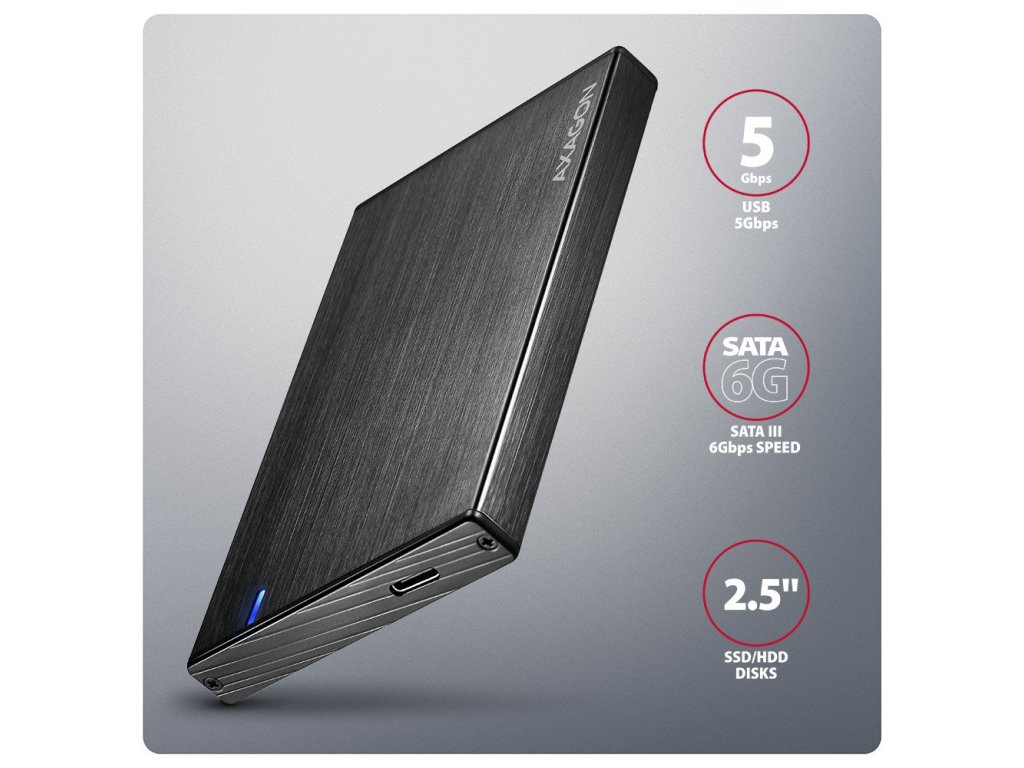Externí box AXAGON EE25-XA6C podporuje špičkový výkon. Disponuje USB-C rozhraním s propustností až 5 Gb/s (USB 3.2 Gen 1) a podporou SATA III (6 Gb/s). Díky tomu dokáže využít maximální rychlost moderních SSD jednotek.