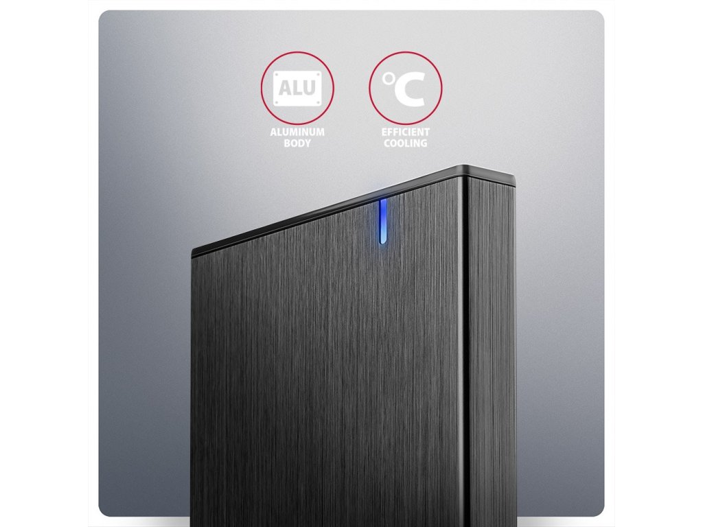 Elegantní hliníkové tělo s kartáčovaným povrchem zajišťuje vynikající mechanickou ochranu disku i efektivní odvod tepla. Box podporuje pokročilé funkce jako TRIM pro SSD disky, čtení S.M.A.R.T. informací a automatické uspávání připojeného disku při nečinnosti.