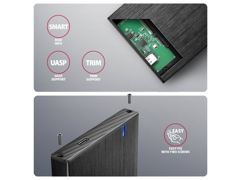 Technologie UASP zajišťuje svižný přenos dat, zatímco funkce TRIM pomáhá udržet výkon SSD v kondici i po letech používání. Box AXAGON EE25-XA6C podporuje také chytrou technologii S.M.A.R.T. pro monitoring stavu disku. Další předností je funkce automatického uspávání po 10 minutách nečinnosti. Samozřejmostí je rychlá a jednoduchá instalace skrze systém Plug & Play a Hot Plug. Stačí jen připojit a hned začne fungovat. Hliníkové tělo ochrání disk před nárazy a dalším mechanickým poškozením. Navíc efektivně odvádí teplo.